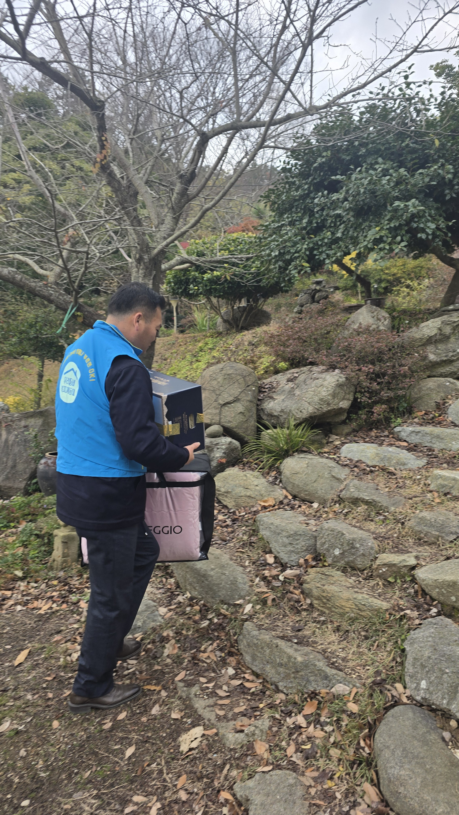지원하는) 따뜻하게 겨울 나시라고 이불 한채와 농식품 꾸러미를 전달하였습니다.