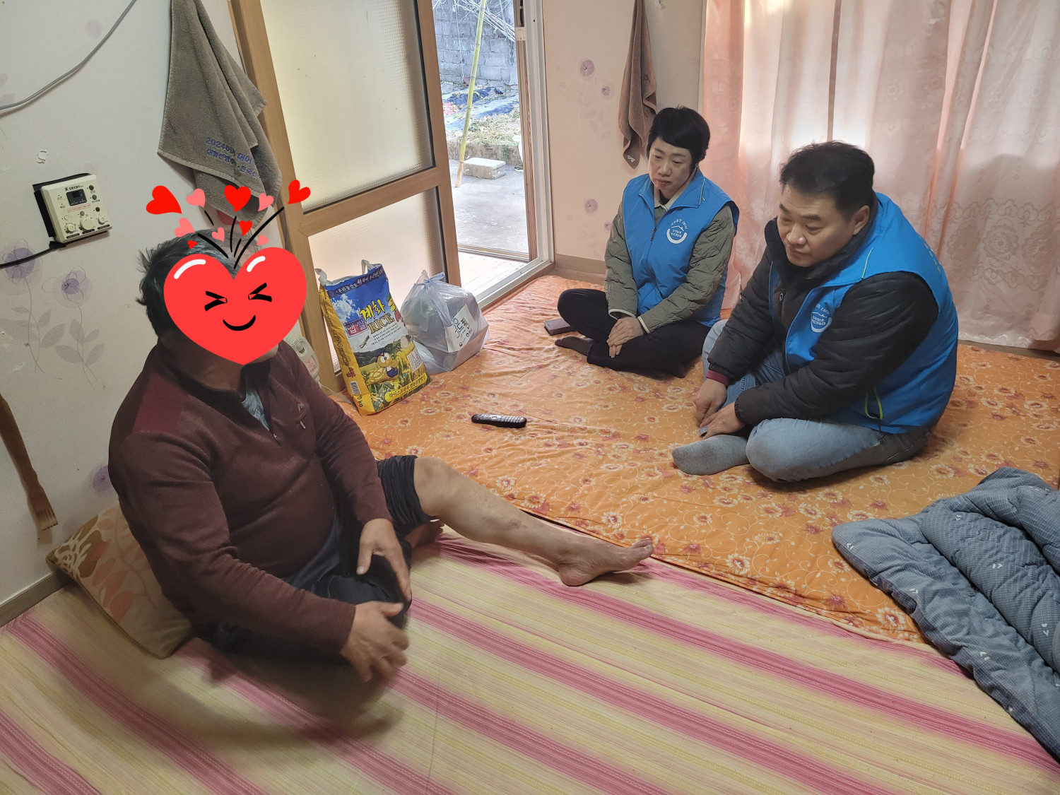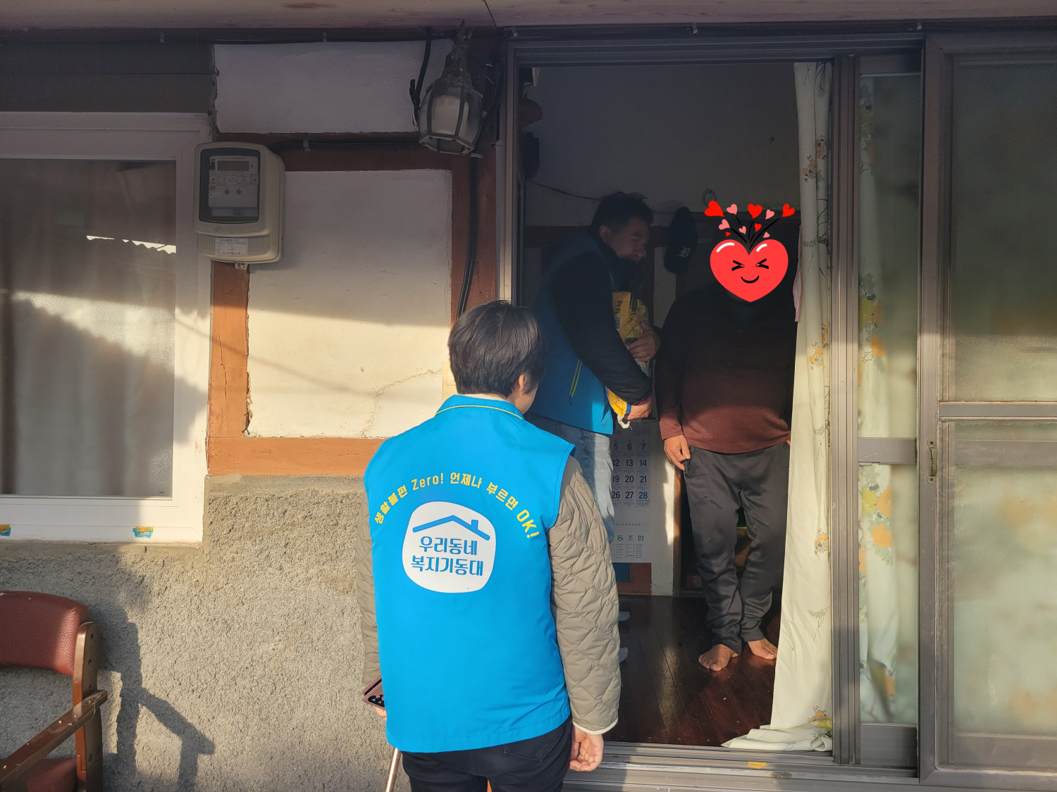 * 출장내용 : 차상위계층 신청접수를 위해 대상 가구를 직접 방문하여 생활실태, 소득 및 재산 현황, 건강상태 등을 종합적으로 상담함. 난방 및 생활 여건이 취약한 것으로 확인됨에 따라 복지기동대를 통해 생활필수 물품을 즉시 전달하고 정서적 안부 확인을 병행함.