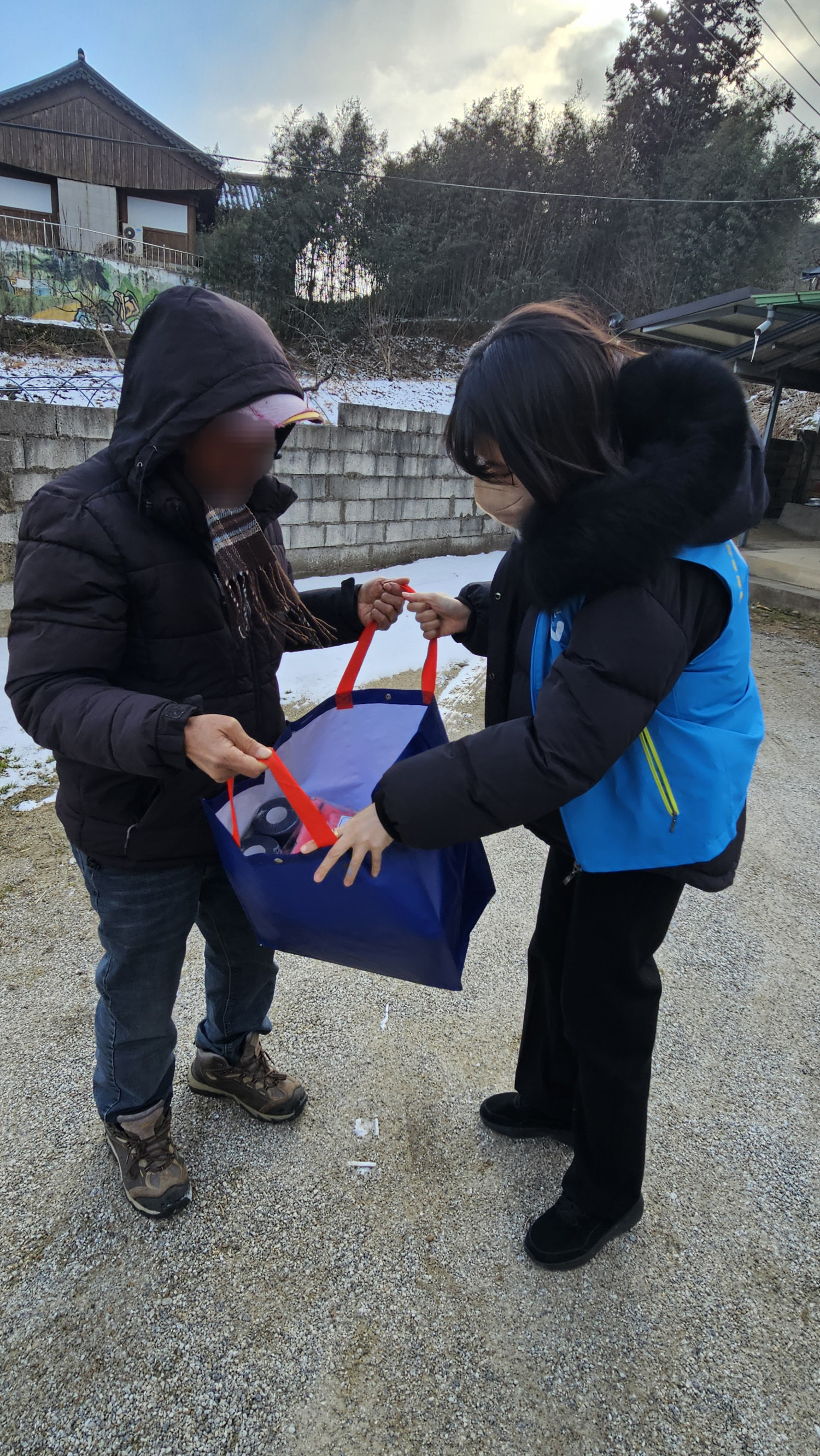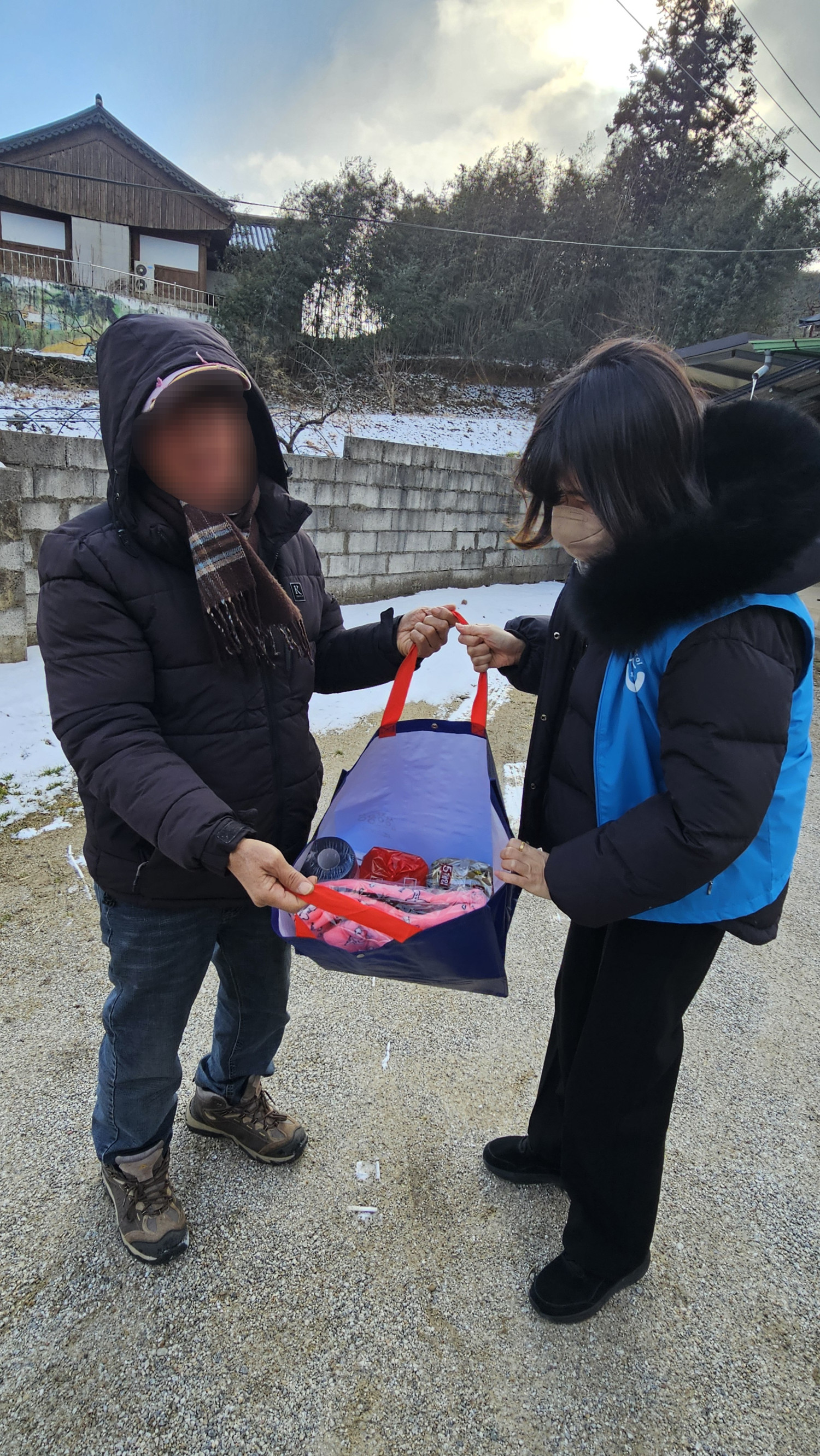 *내용 : 오늘은 공동모금회에서 후원해주신 담요와 난방용품 및 생필품을 통합사례관리 대상자이신 이○귀 님께 전달해드리기 위해 우리동네복지기동대와 통합사례관리사 선생님이 함께 출동했습니다.