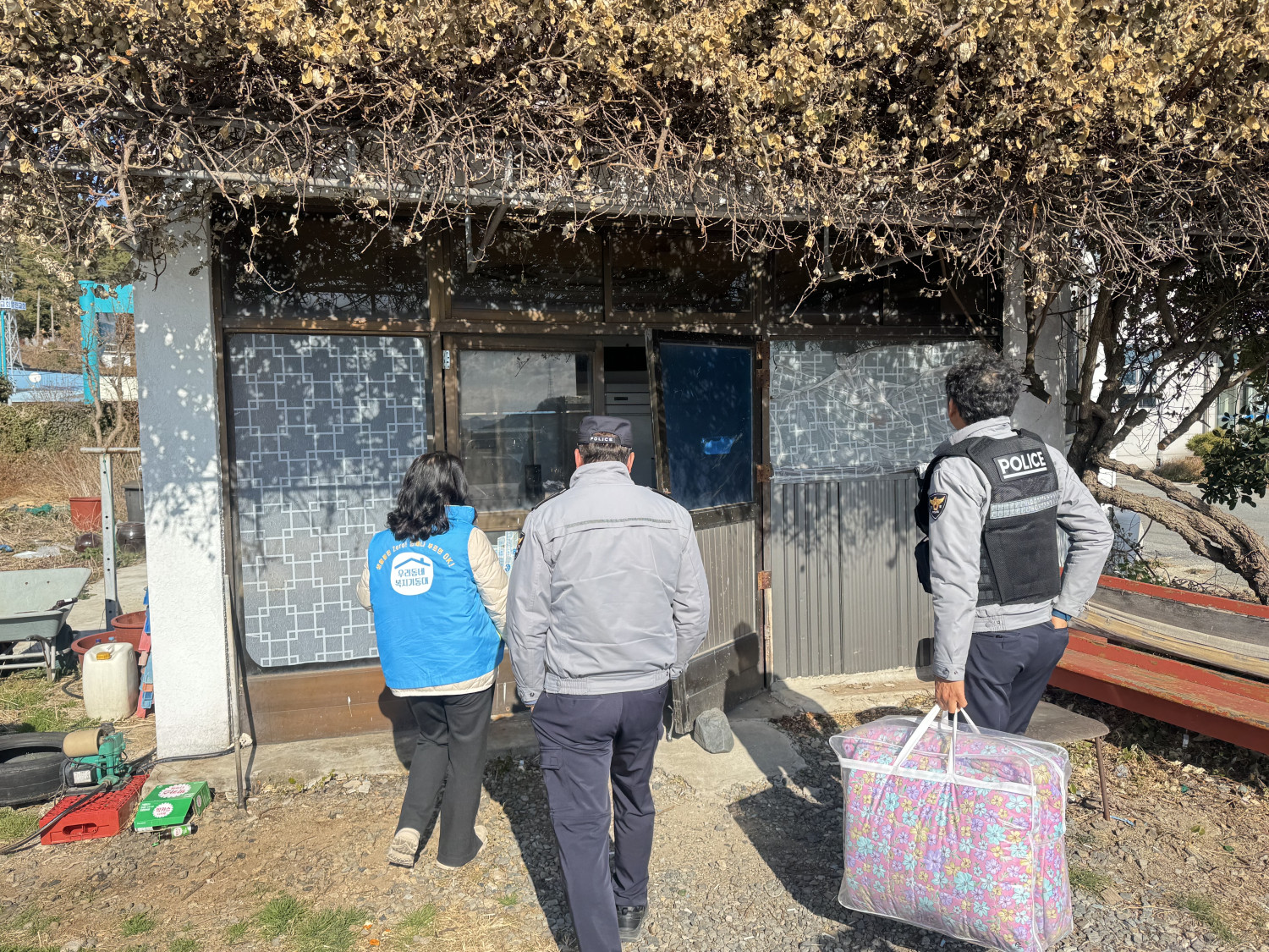 활동내용: 위기가구에 복지기동대원과 금일파출소장 및 경찰관이 함께 방문하여 생활실태를 확인하고 애로사항 및 불편사항을 청취함. 추운 겨울철 한파로 생활에 어려움이 있어 겨울이불을 전달하였으며, 대상자의 안전 확인과 복지 지원을 위해 향후 지속적인 관심 및 연계를 검토함.