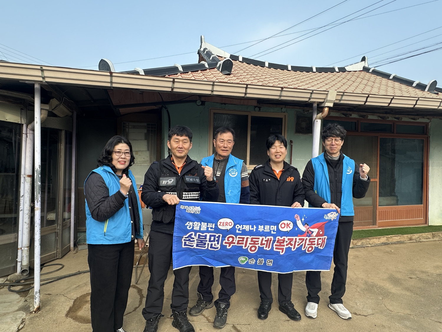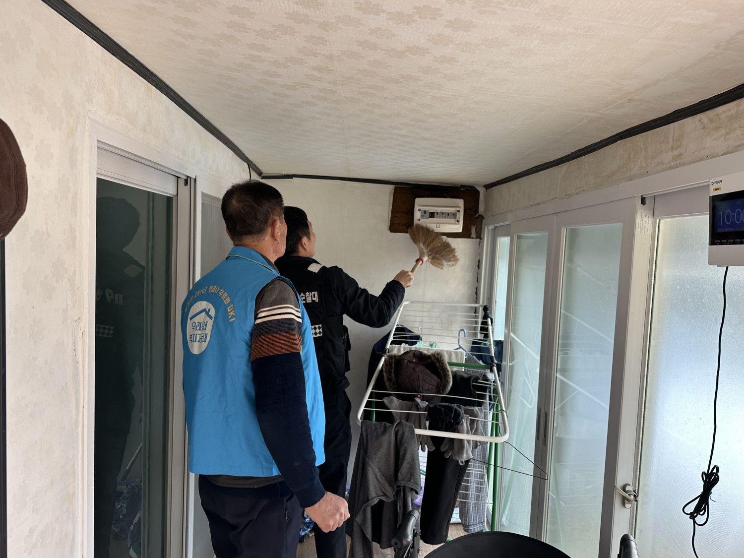 "동절기 화재위험및낙상위험 점검을 통해 주택내 안전사고 발생을 미리 예방하고자 손불면 우리동네복지기동대 와 119생활안전순찰대와 협력하여 화재요인 점검 및 안부살피기 활동하였습니다."