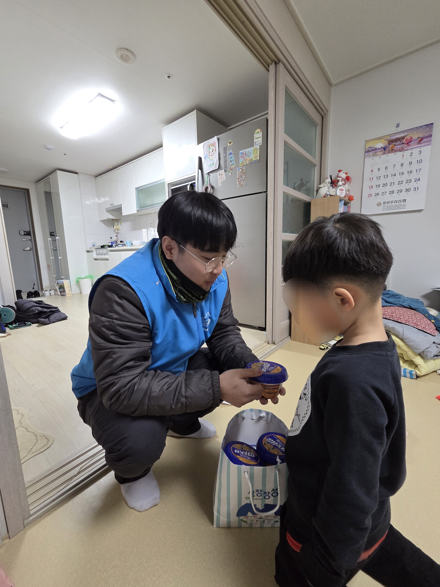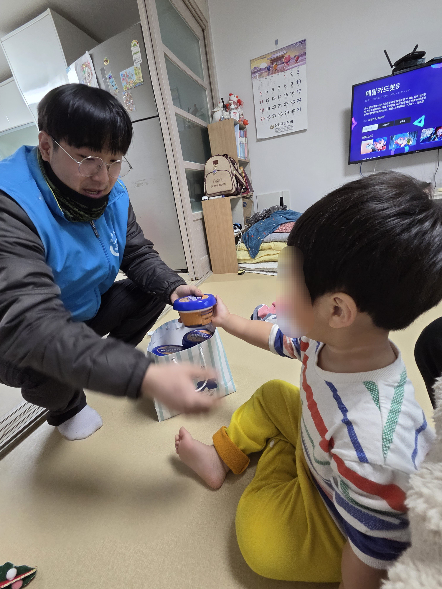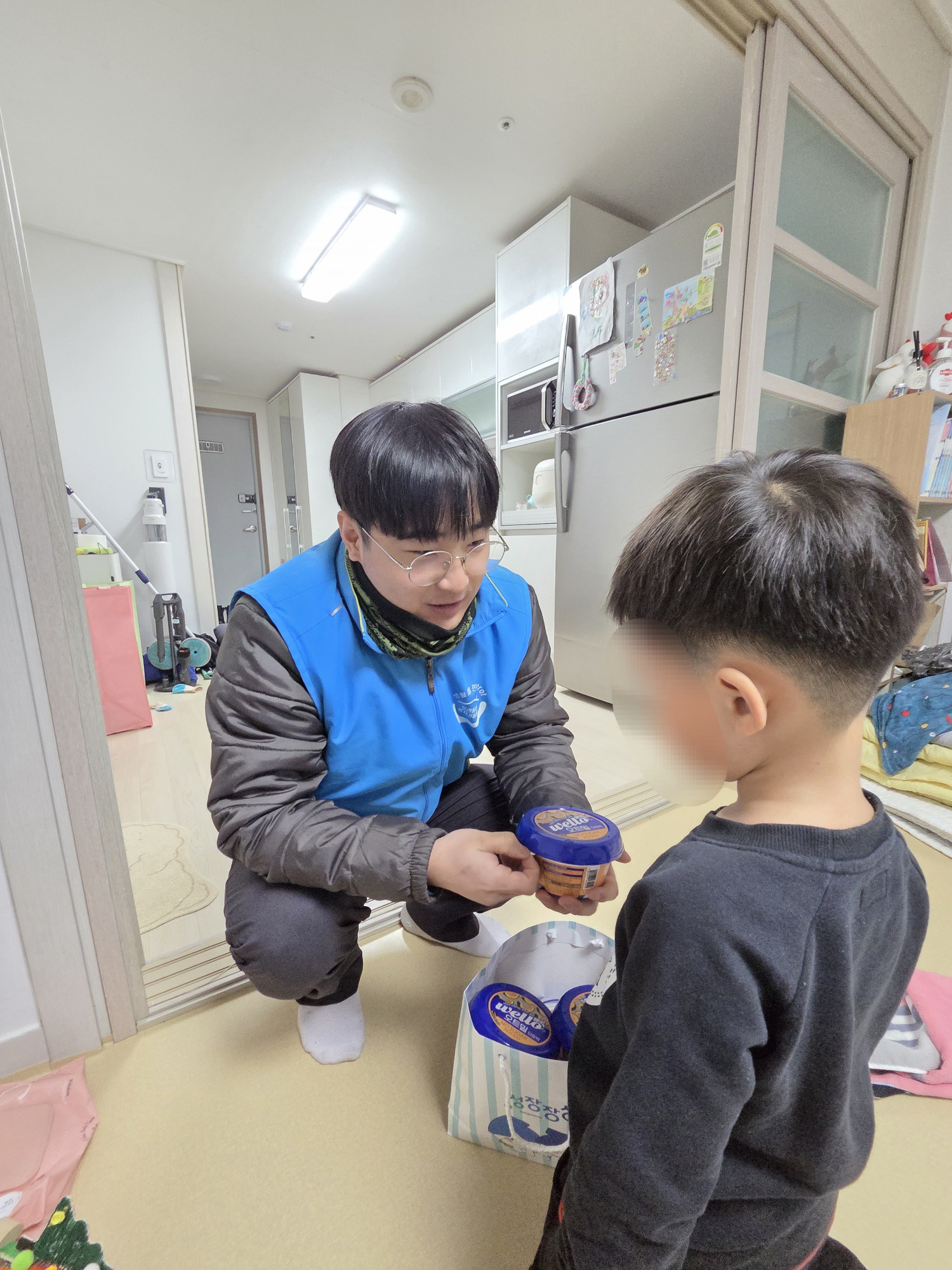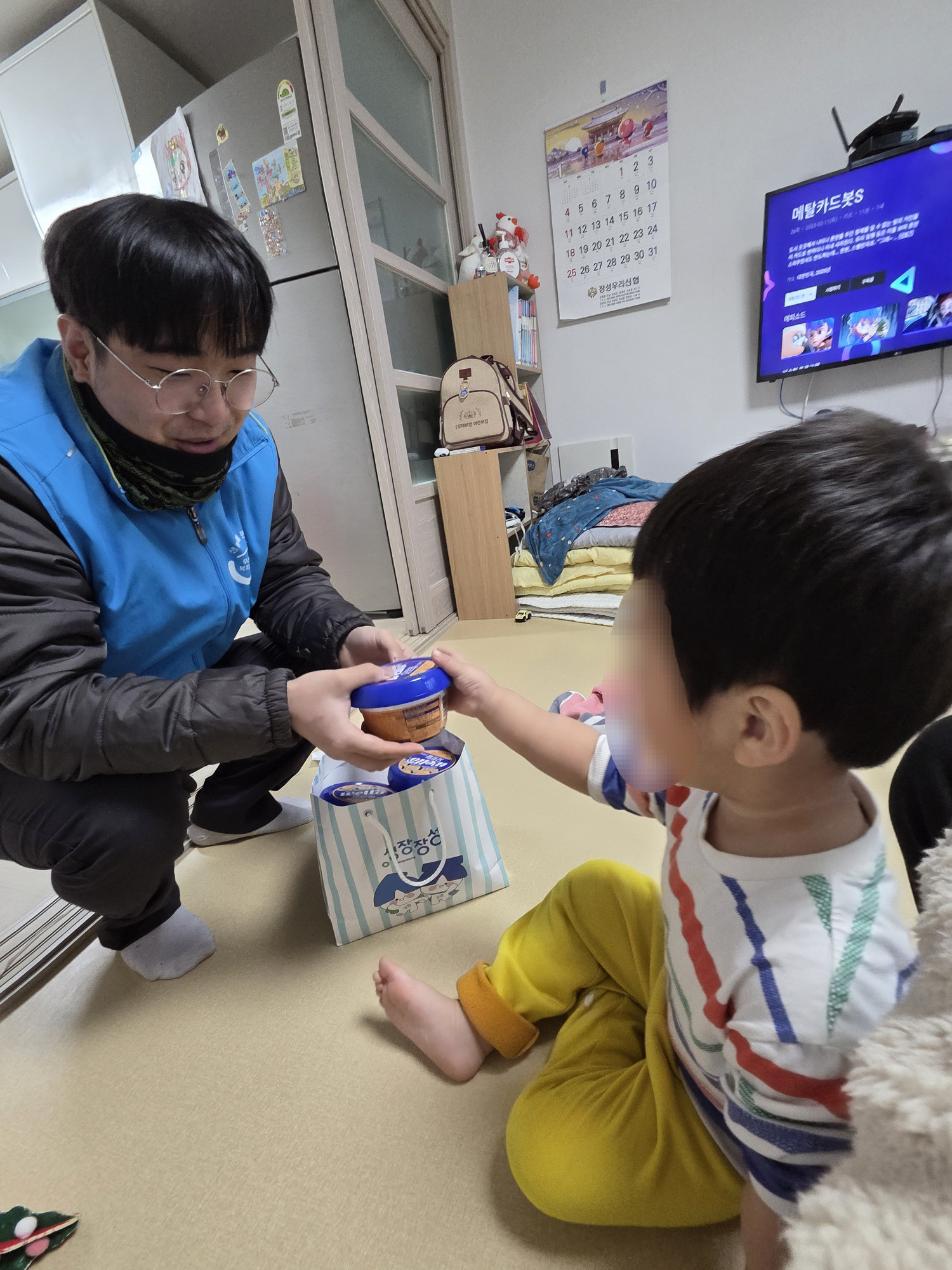 장애가 있음에도 맞벌이로 일터에 계시는 부모님을 대신해, 돌봄 선생님께 후원물품을 대신 전달하며 설명드렸고, 자녀분들이 후원물품에 관심을 가지며 통합사례관리사 선생님과 우리동네복지기동대 대원들을 경계하지 않도록 친근하게 다가가며 후원물품에 대해 간략하게 설명해주었습니다.
