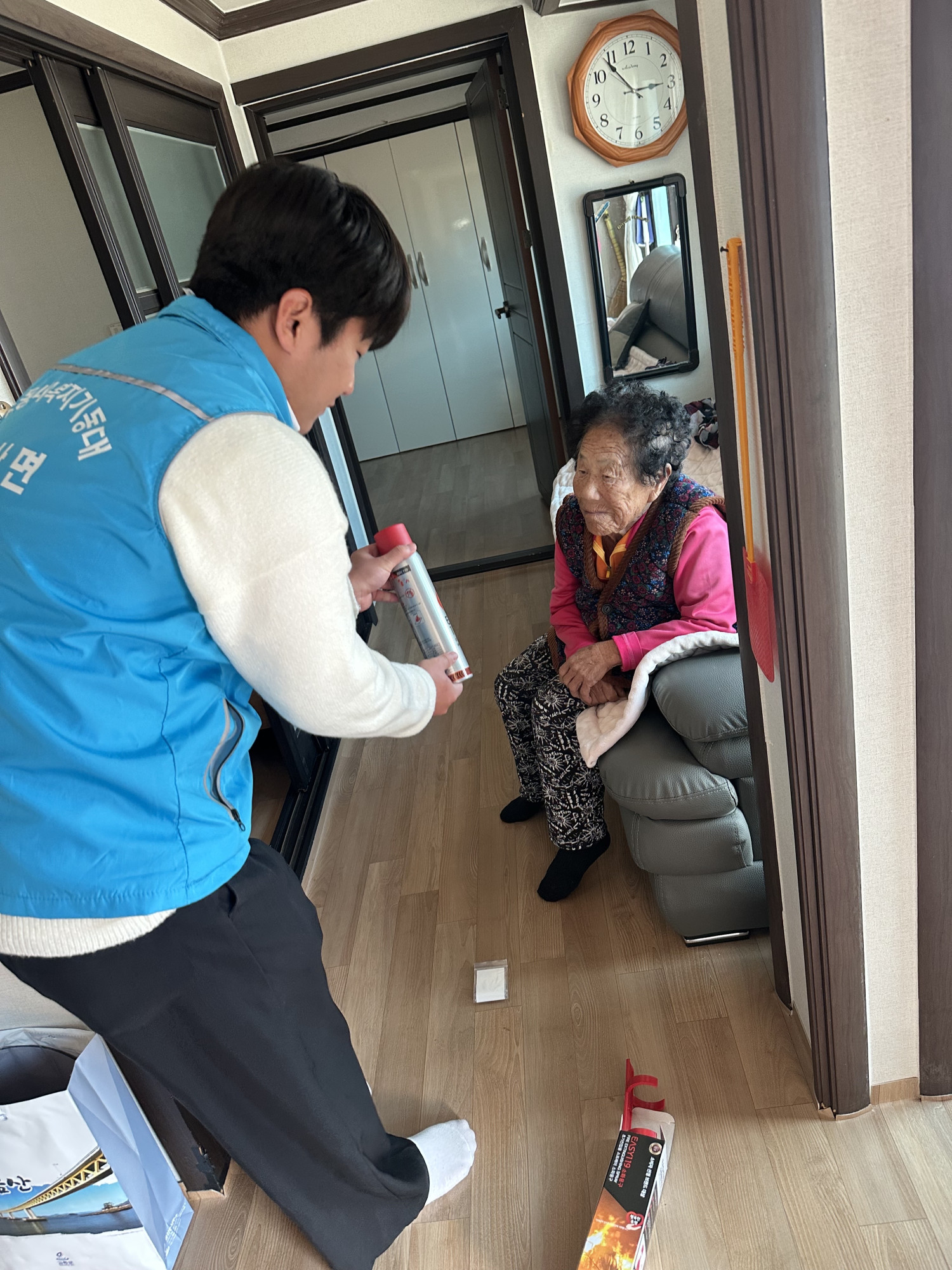 겨울철 화재예방을 위해 119생활안전순찰대와 함께 독거노인 가구에 안전꾸러미를 전달하였습니다. 연기감지기를 설치하고, 사용하기 편한 작은 사이즈의 스프레이식 소화기도 제공하고 안전사고 예방을 위해 미끄럼 방지 매트를 제공하는 등의 활동을 시행하였습니다.