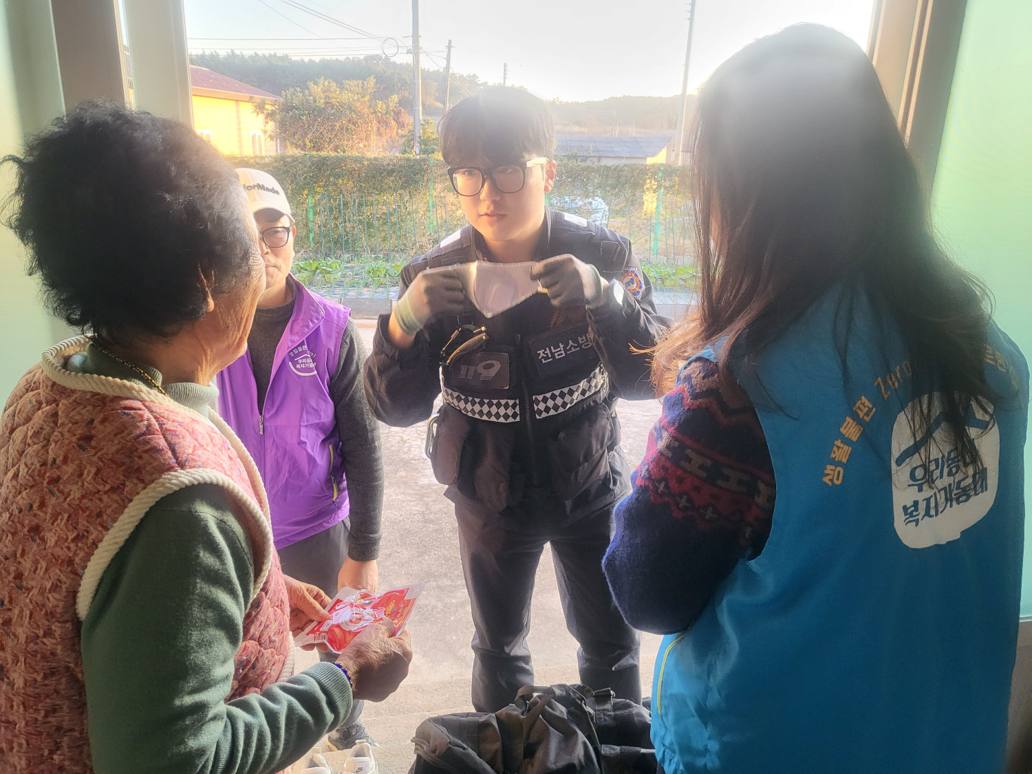 안좌면 복지기동대는 119생활안전순찰대와 합동으로 동절기 위기가구를 점검하고, 화재 및 안전사고 예방을 위해 연기감지기 및 스프레이 소화기 설치, 산소발생 마스크 전달,미끄럼방지 매트를 설치하여 생활 안전 지원을 추진하였습니다.