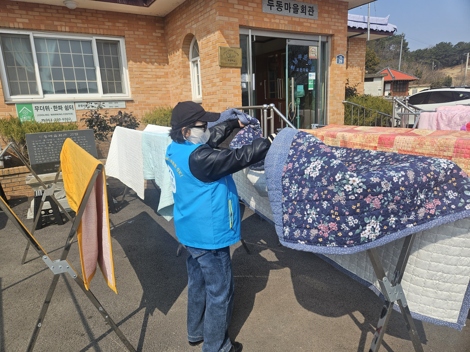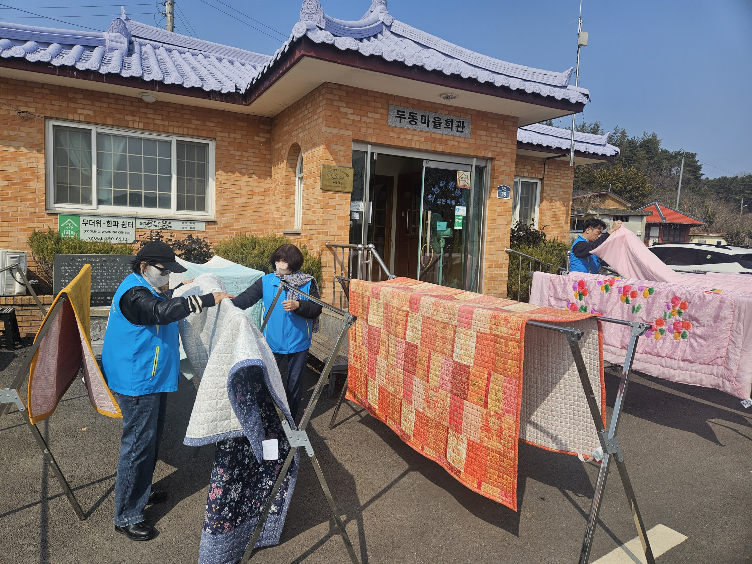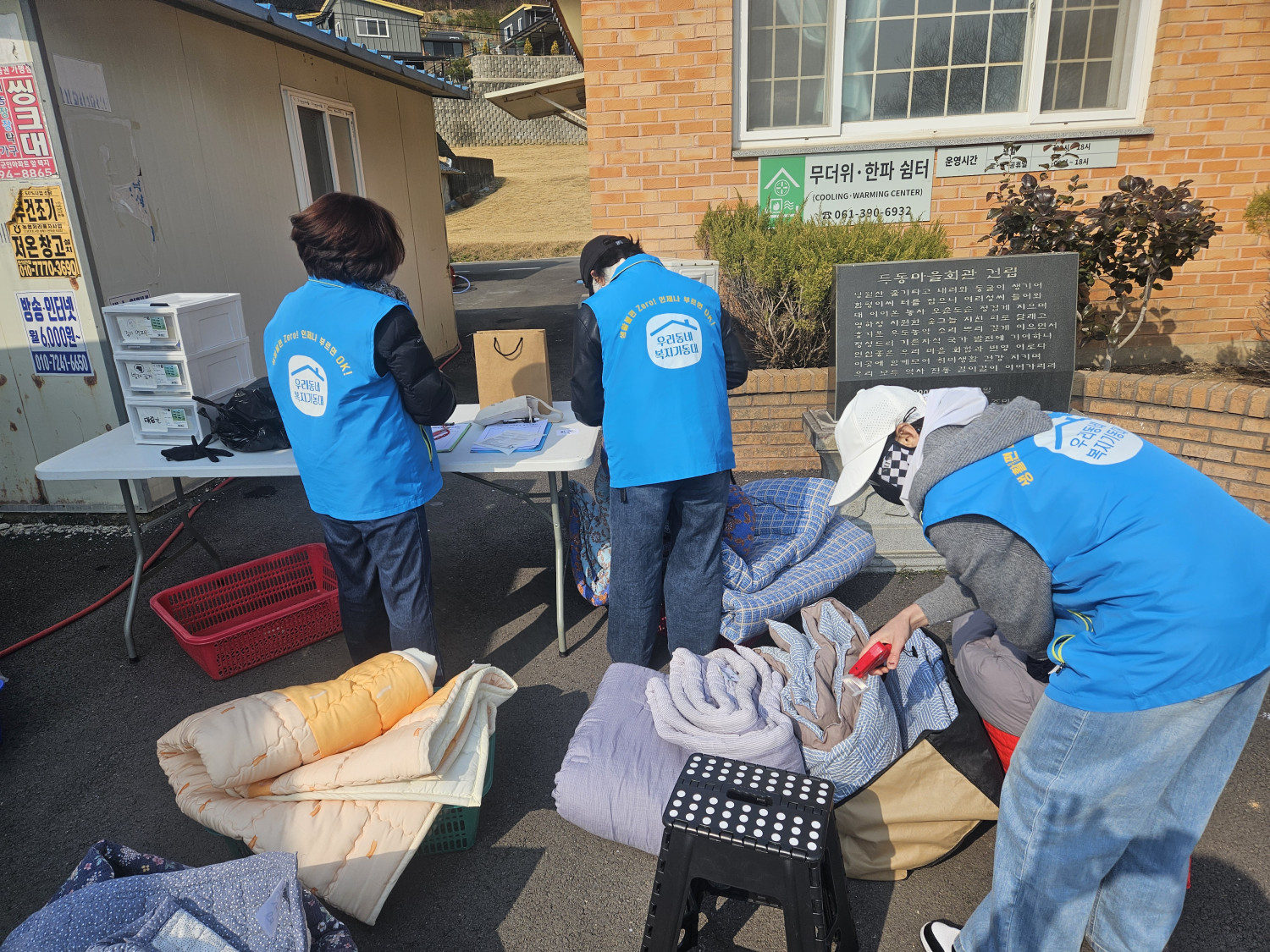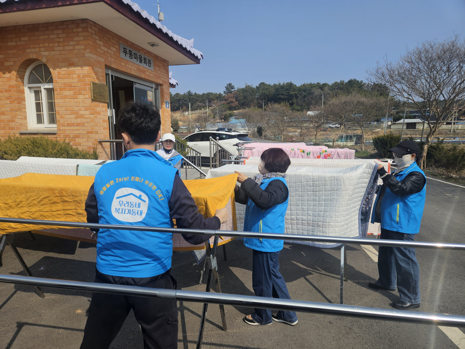 오늘은 삼서면의 두동경로당을 이용하시는 어르신들을 대상으로 이불세탁을 도와드리기 위해 우리동네복지기동대 대원 5명이 출동했습니다.