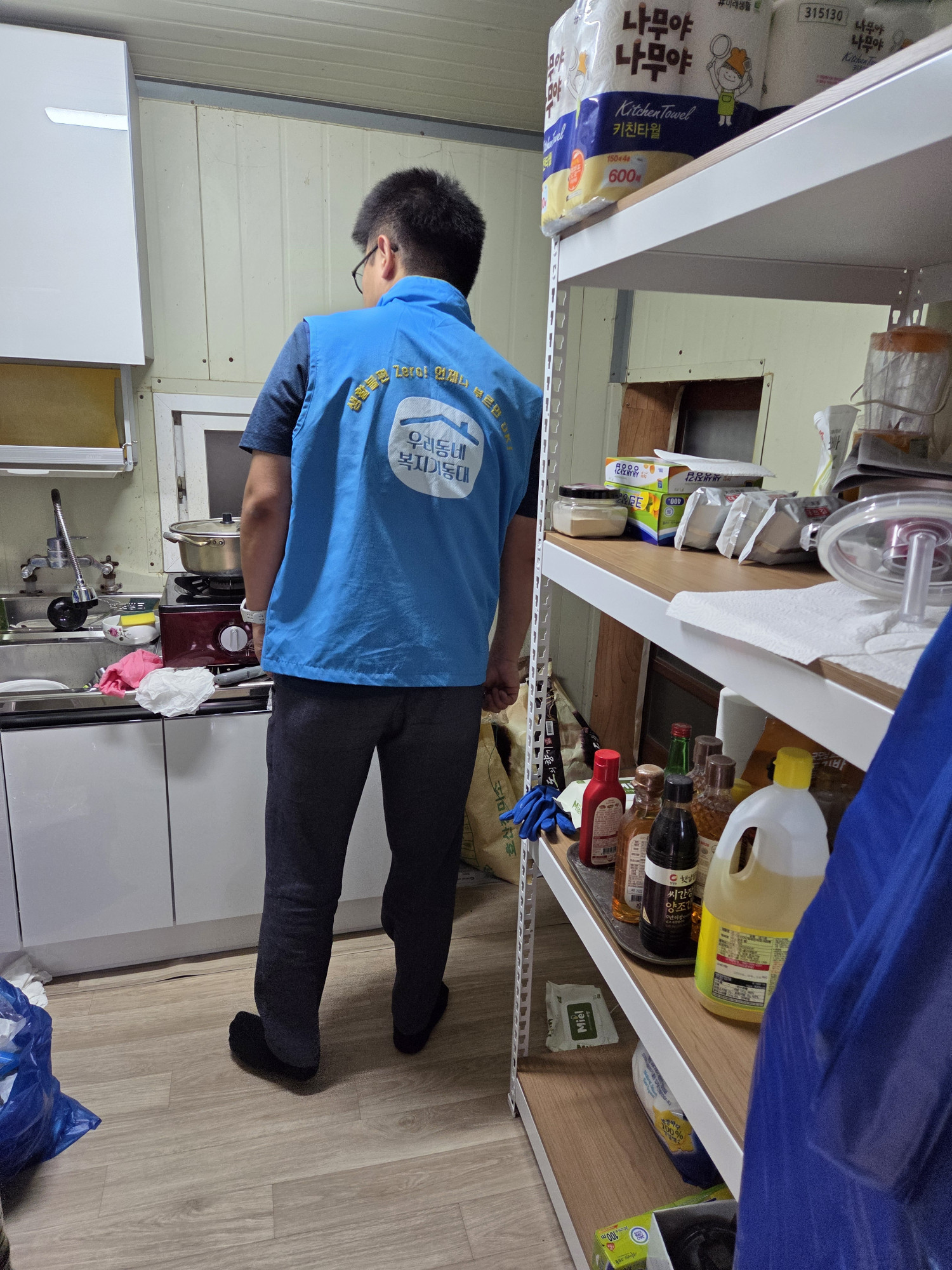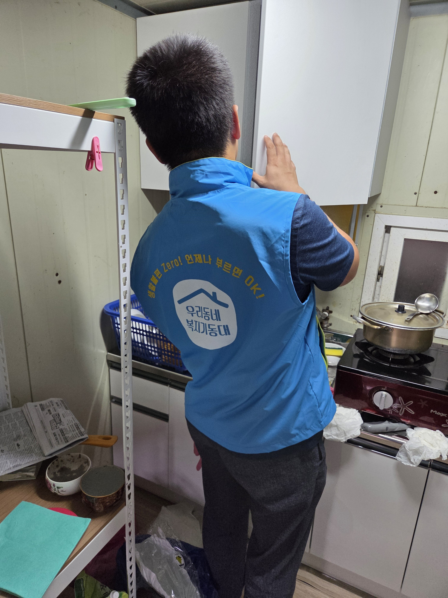 주방이 좁고 선반이 없으며 낡은싱크대만 있어 모든 주방용품이 바닥에 놓여져 있었으며 쥐구멍으로 쥐가 들어와 쥐잡이용 진드기를 설치해 놓은 상태로 위생상 도움이 필요한 상황이었습니다.