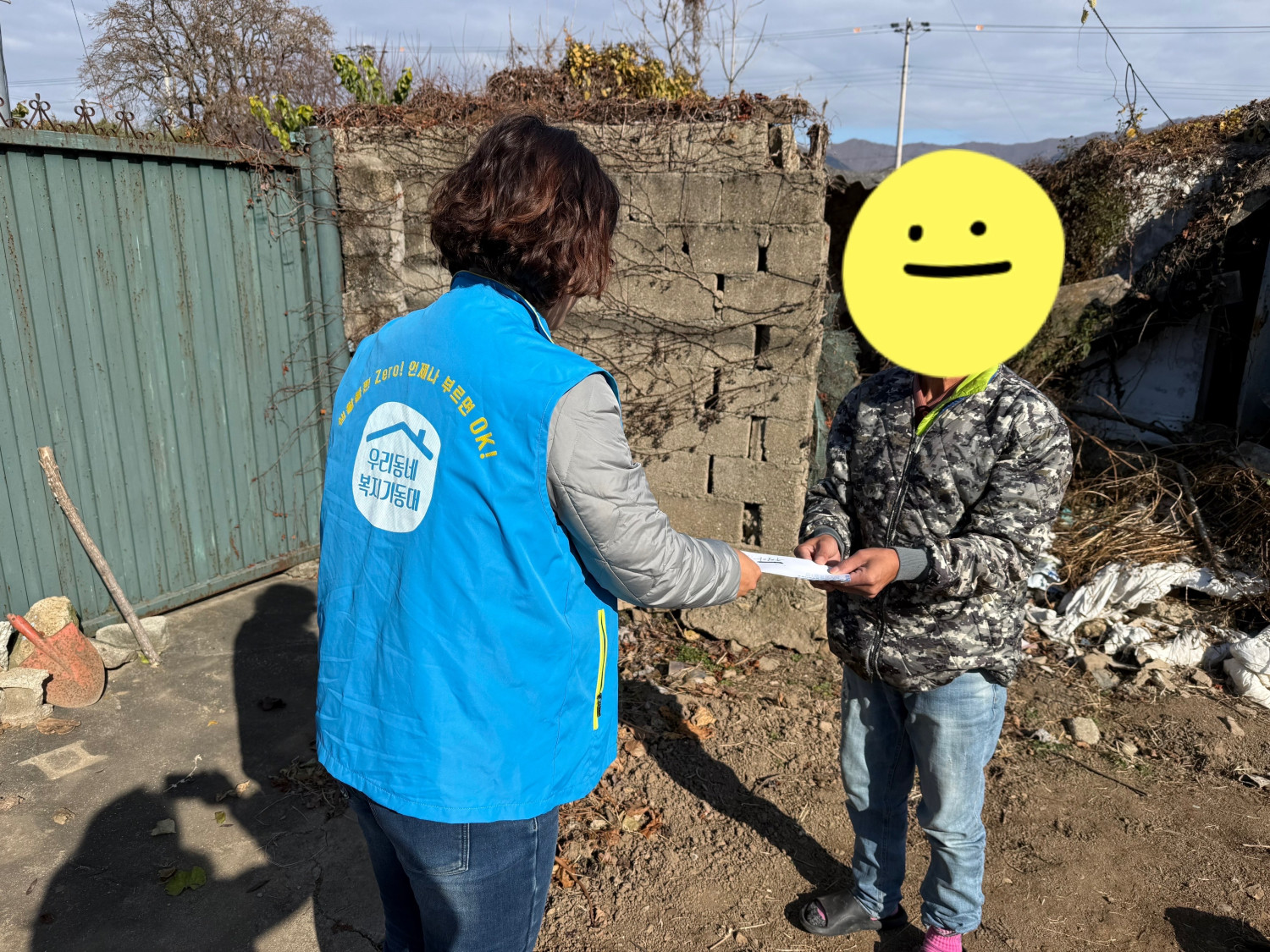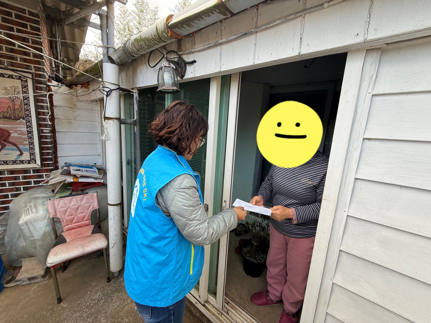*상황: 독거 노인의 안부를 살피고 생필품 전달 시행함. 동절기 난방 사용 관련 안전수칙을 전달하고 점검함.