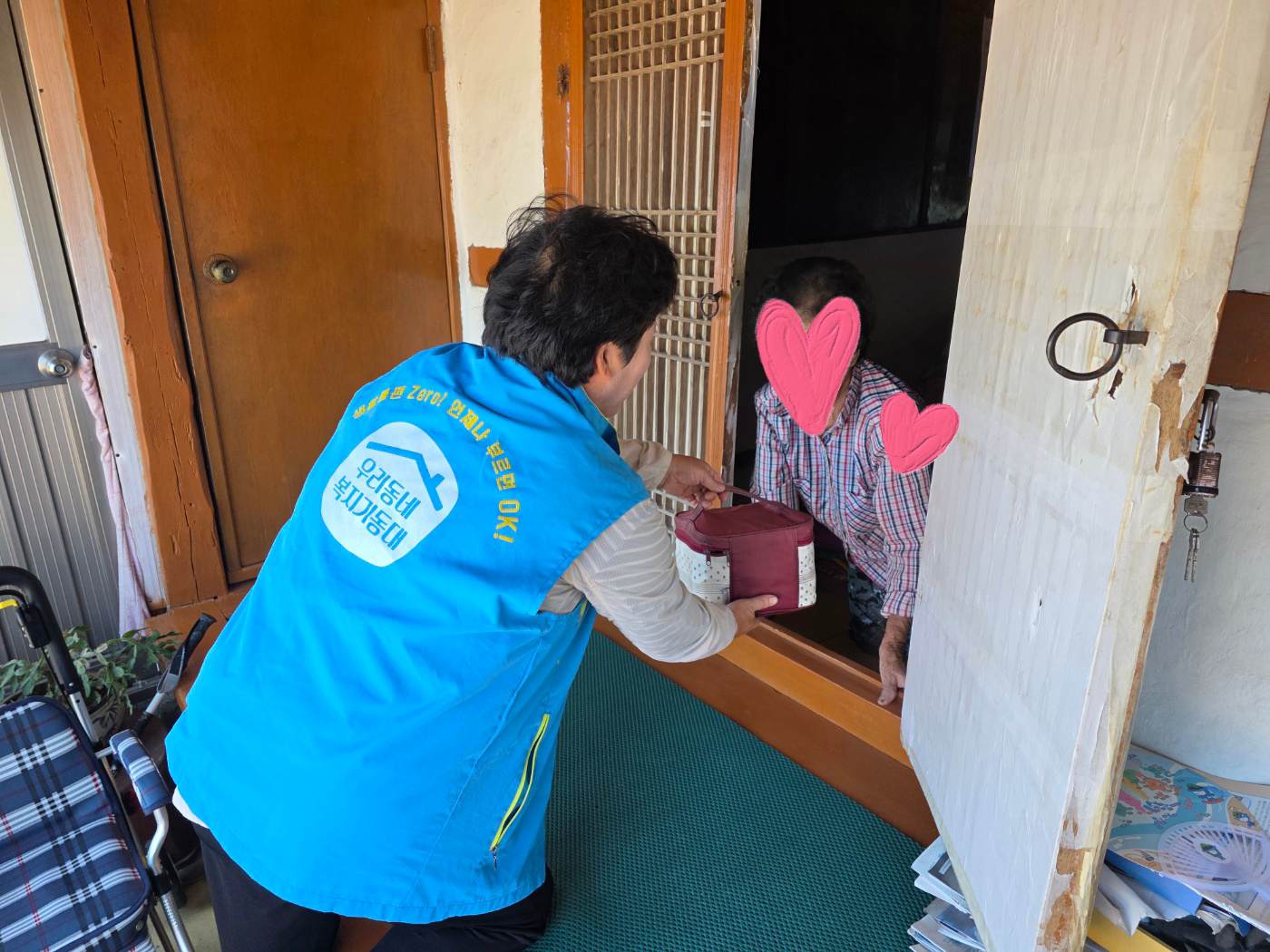 활동내용:복지기동대가 지역의 독거어르신 가정을 방문해 정성껏 준비한 밑반찬을 전달하며 따뜻한 안부를 여쭙고 생활 어려움이 없는지 살핌. 작은 나눔이 어르신들께 위로와 힘이 될 수 있도록 세심히 살피며 따뜻한 온기를 전함.