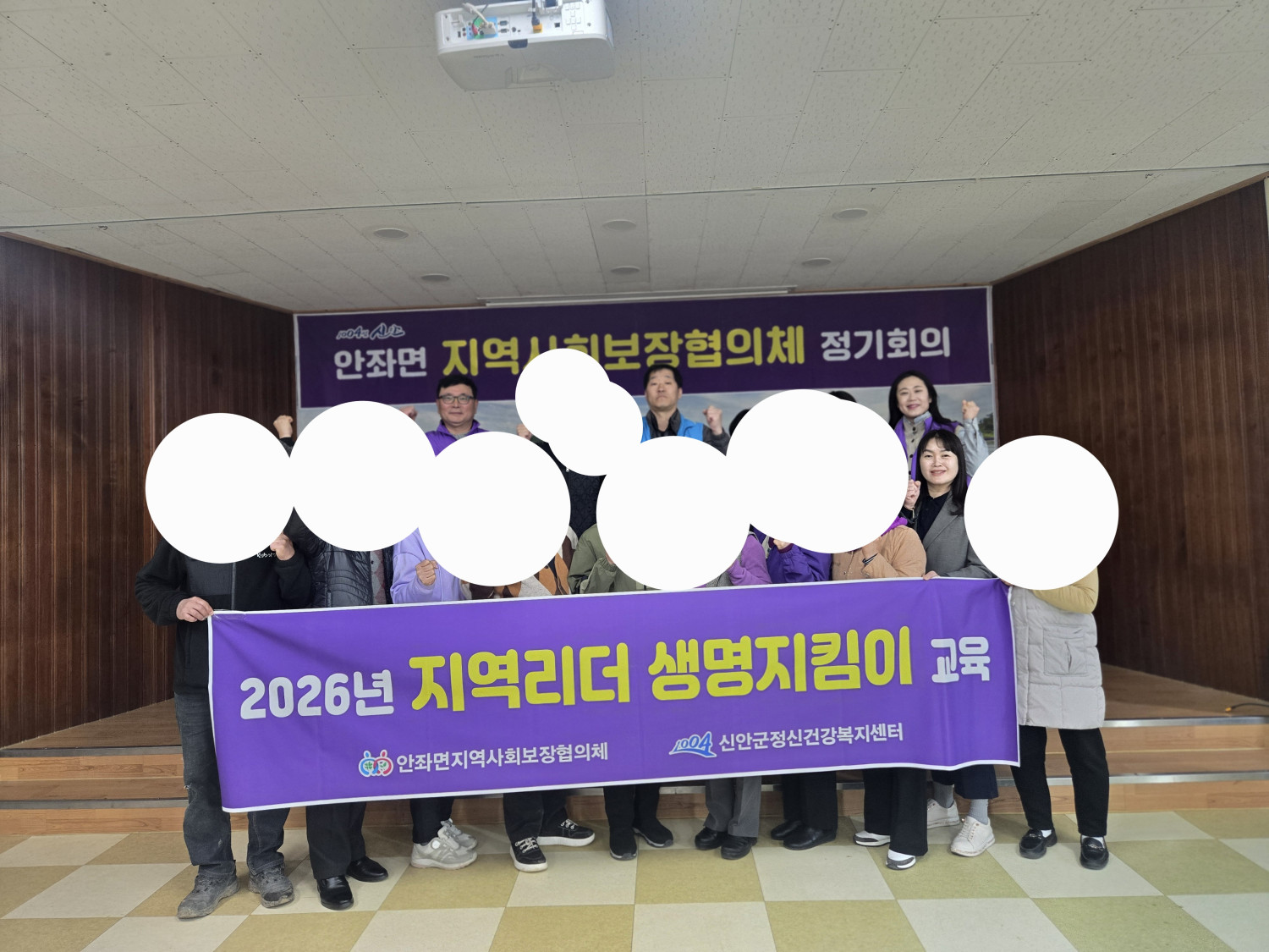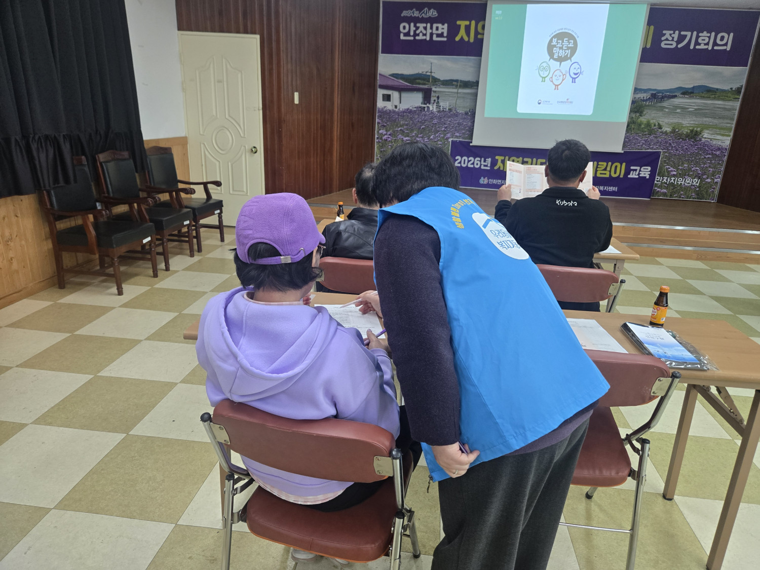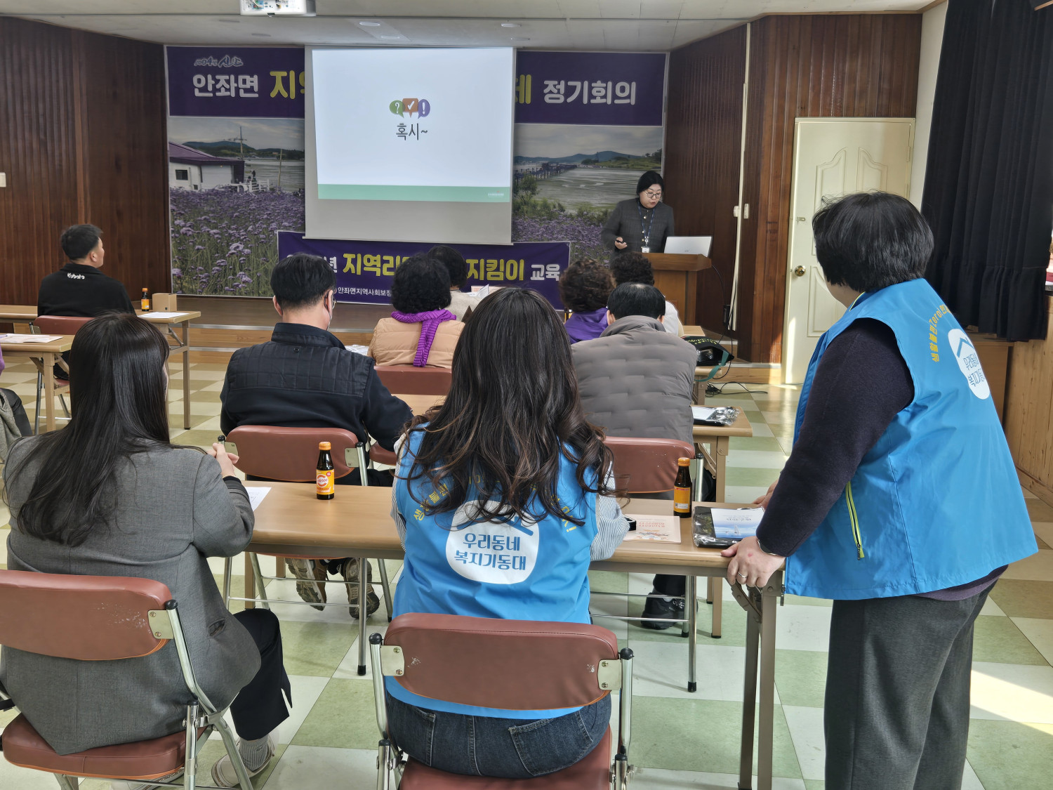 안좌면 지역사회보장협의체 위원 16명을 대상으로 자살예방교육을 실시함. 교육을 통해 자살 위험요인 및 경고신호, 자살 위기 대응 기술 등에 대해 안내하고 위기가구 발견 시 대응 방법을 공유하였으며, 우리동네복지기동대 사업도 함께 홍보함.
