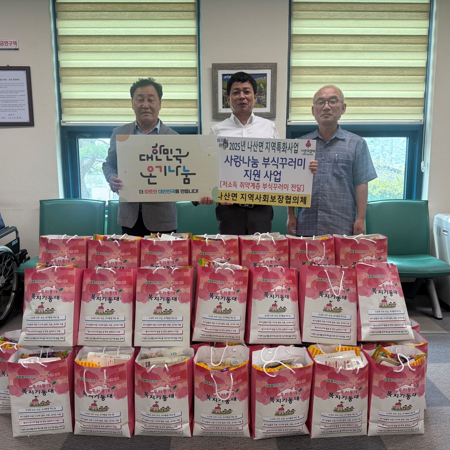 나산면 우리동네 복지기동대는 지역에 계신 독거노인, 장애가구 등 취약계층을 대상으로 미역국, 식혜, 과자 등 부식꾸러미를 전달하였습니다.