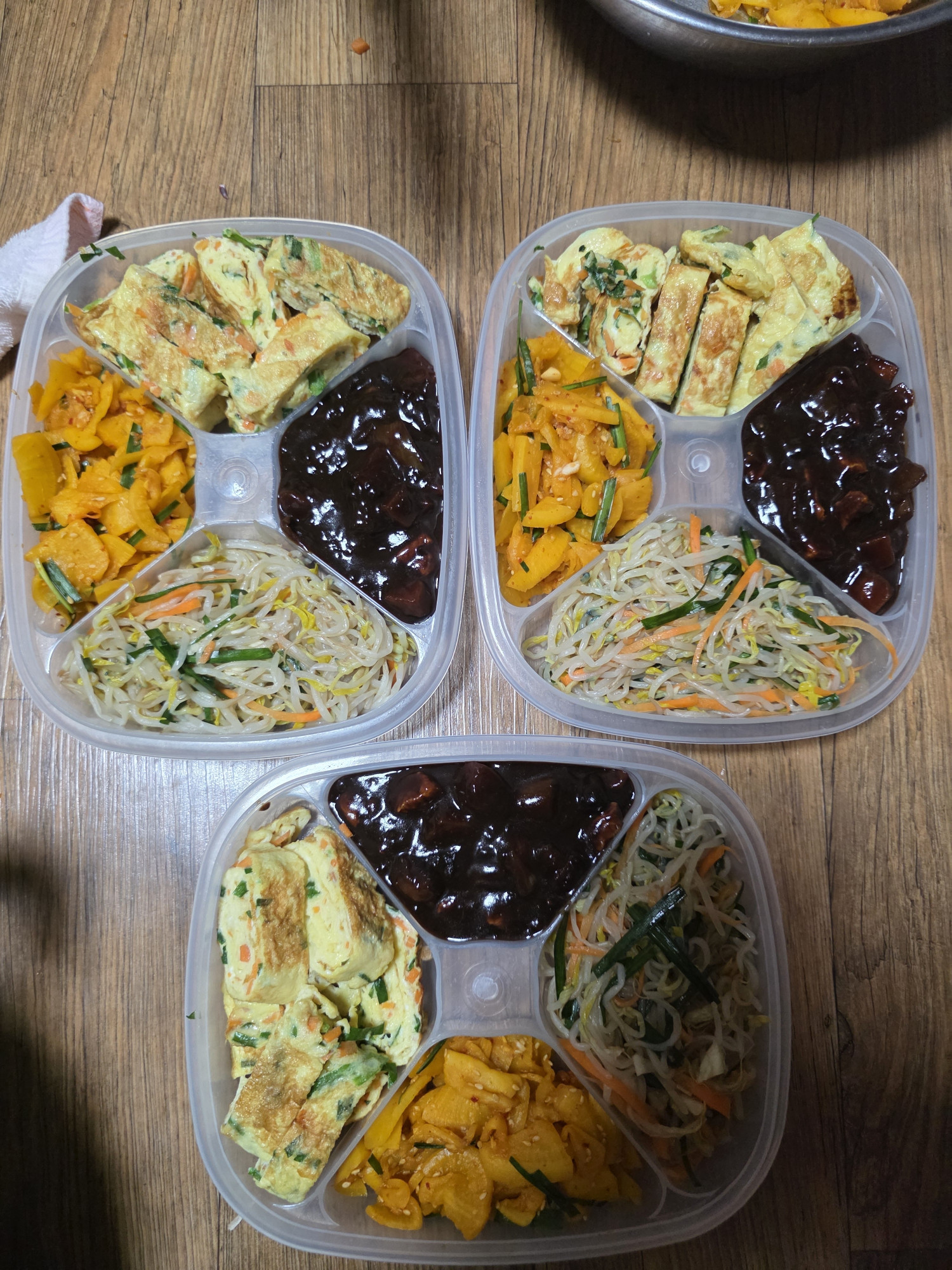 이번주 반찬은 짜장, 계란말이, 단무지무침, 숙주나물 무침입니다☺️☺️