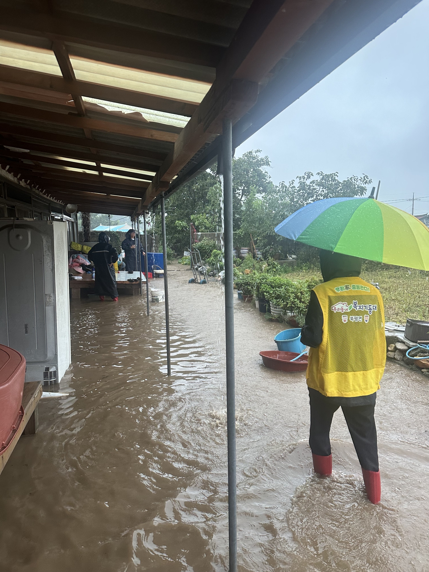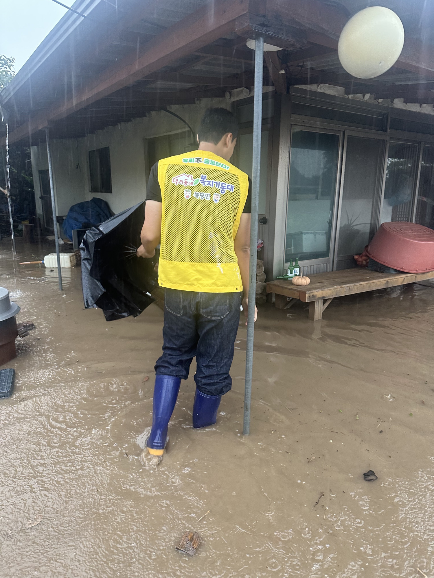 한꺼번에 많은양에 비가 내렸습니다 혼자 사시는 어르신댁 마당에 물이 차서 얼릉 달려갔습니다