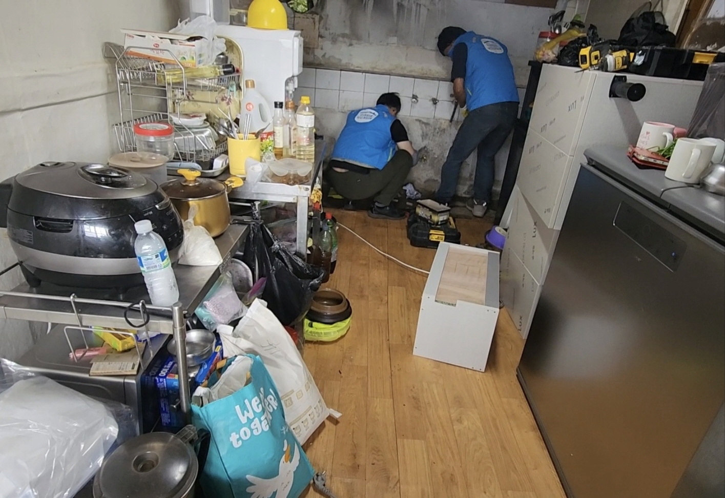 싱크대 아래가 썩어내려 쥐까지 주방으로 들어오는 등 주거환경이 매우 열악한 독거노인 가구를 복지기동대가 찾아가서 봉사활동 펼침