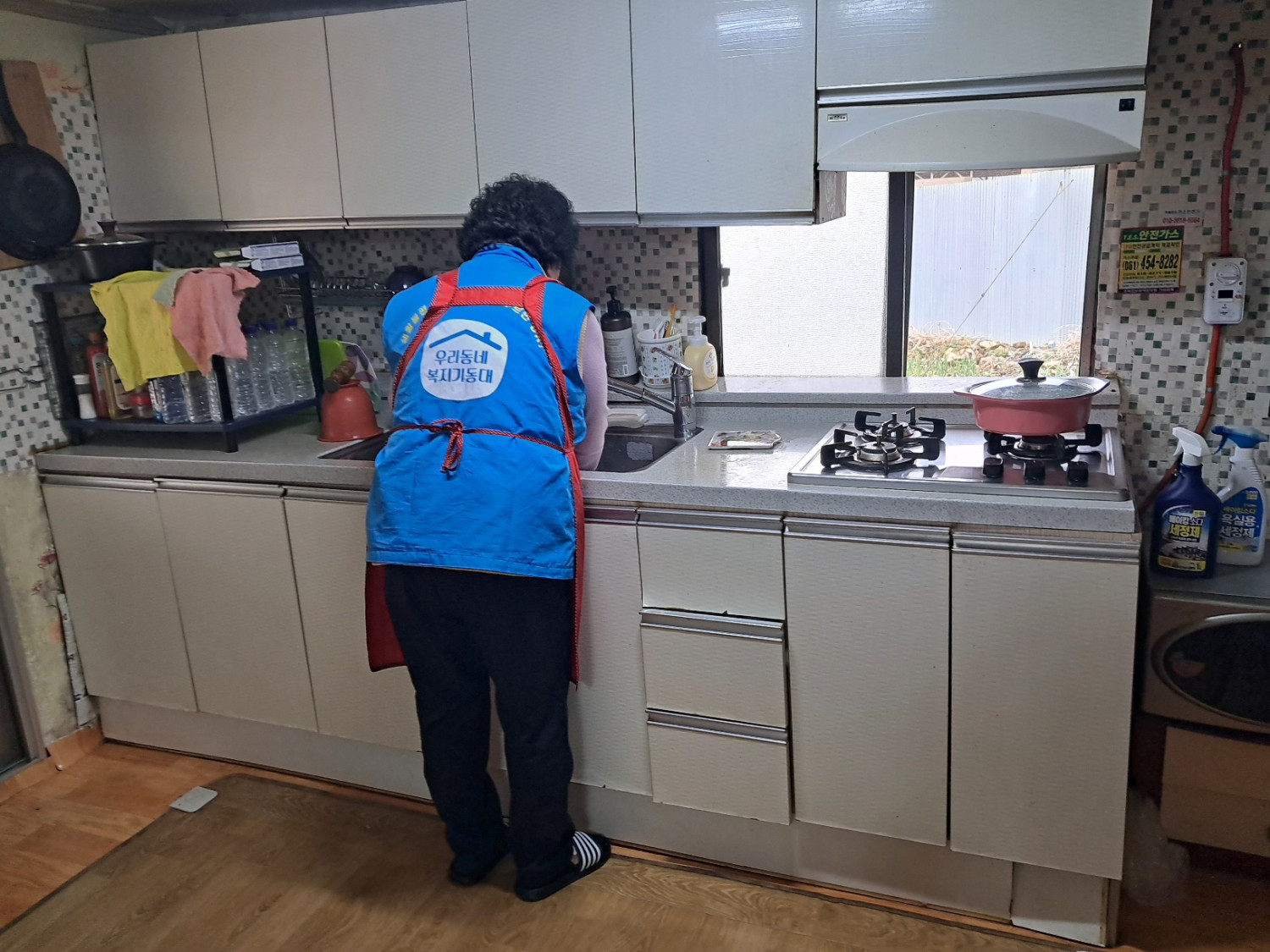 주방 싱크대 칸칸이 깔려 있는 오래된 신문지를 새 신문지로 교체해드리고