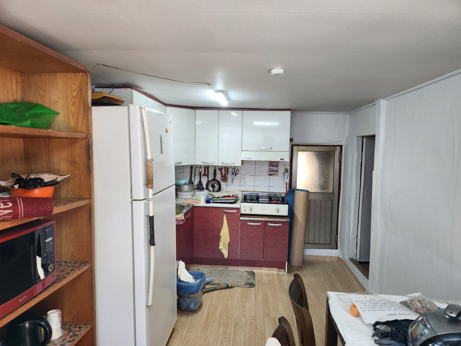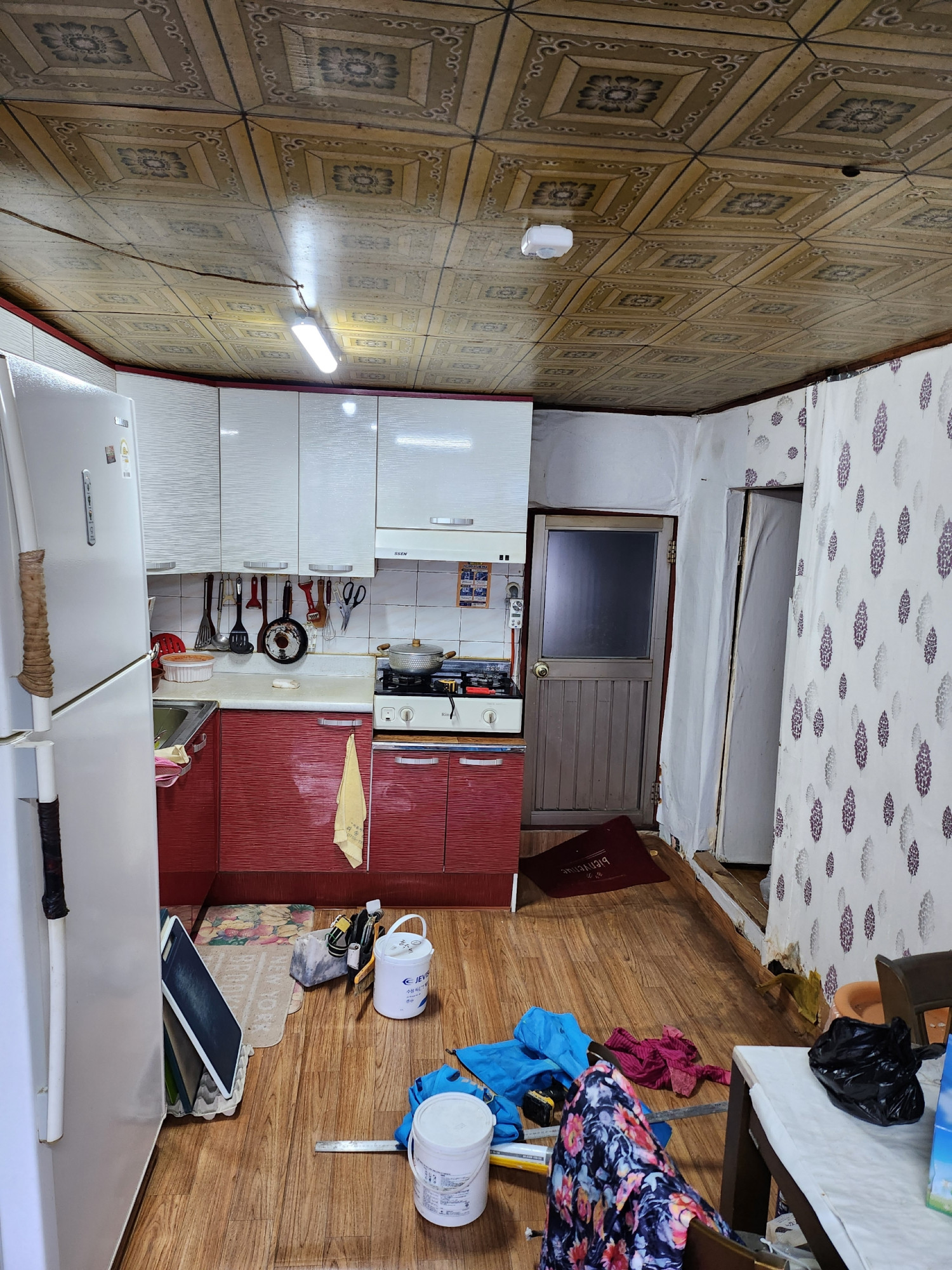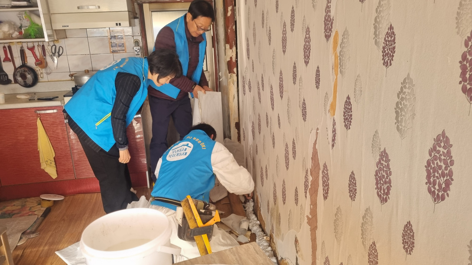 노후화로 벽이 허물어지고 있다며 도움을 요청한 독거노인 가정을 찾아가 주방 정리 및 도배장판 서비스 활동 실시함.