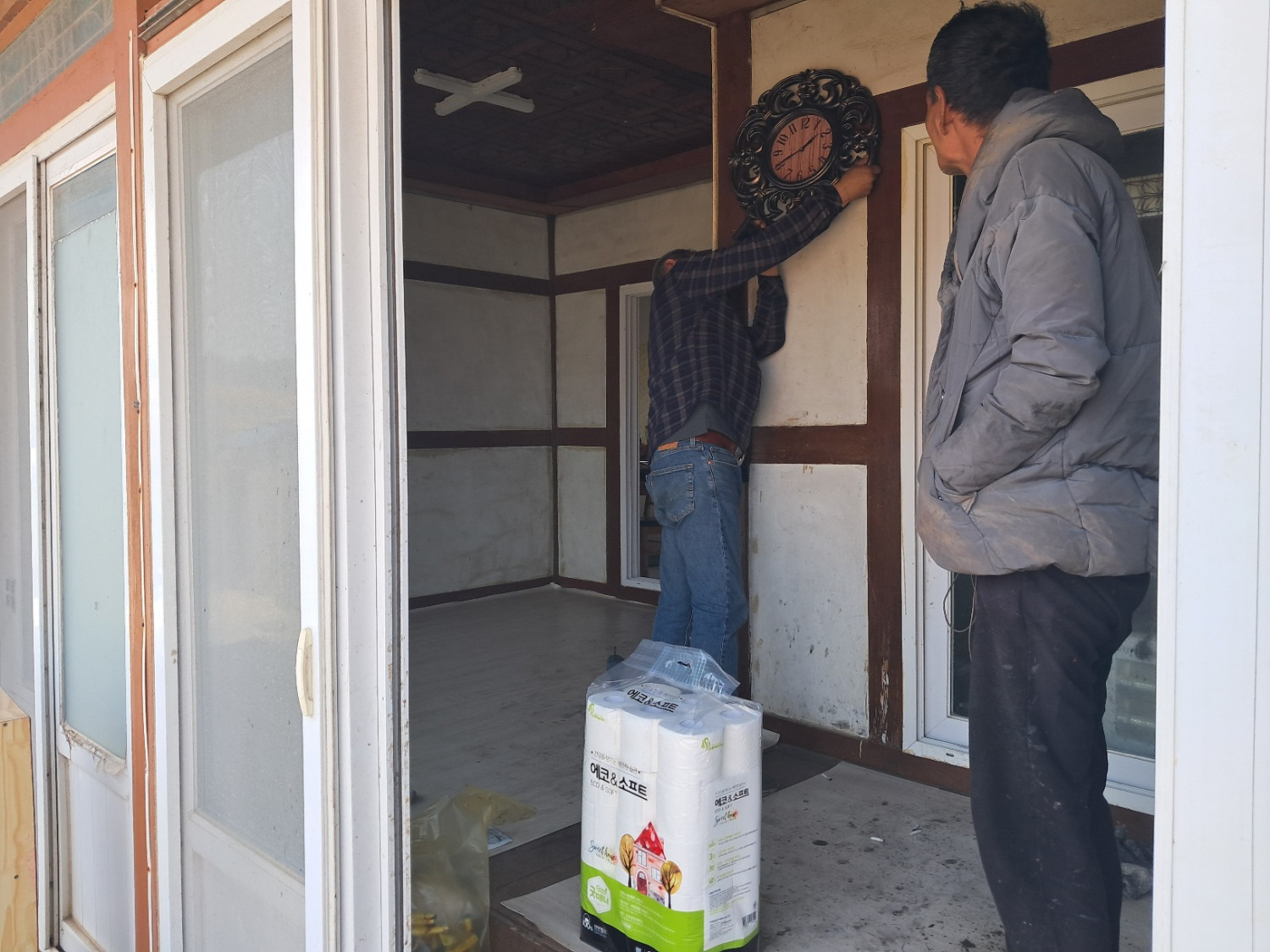 두번째 독신 남성 1인 가구 두 곳에 사회복지과에서 준 후원품 컵라면, 휴지, 벽시계를 선물로 드리고 왔어요