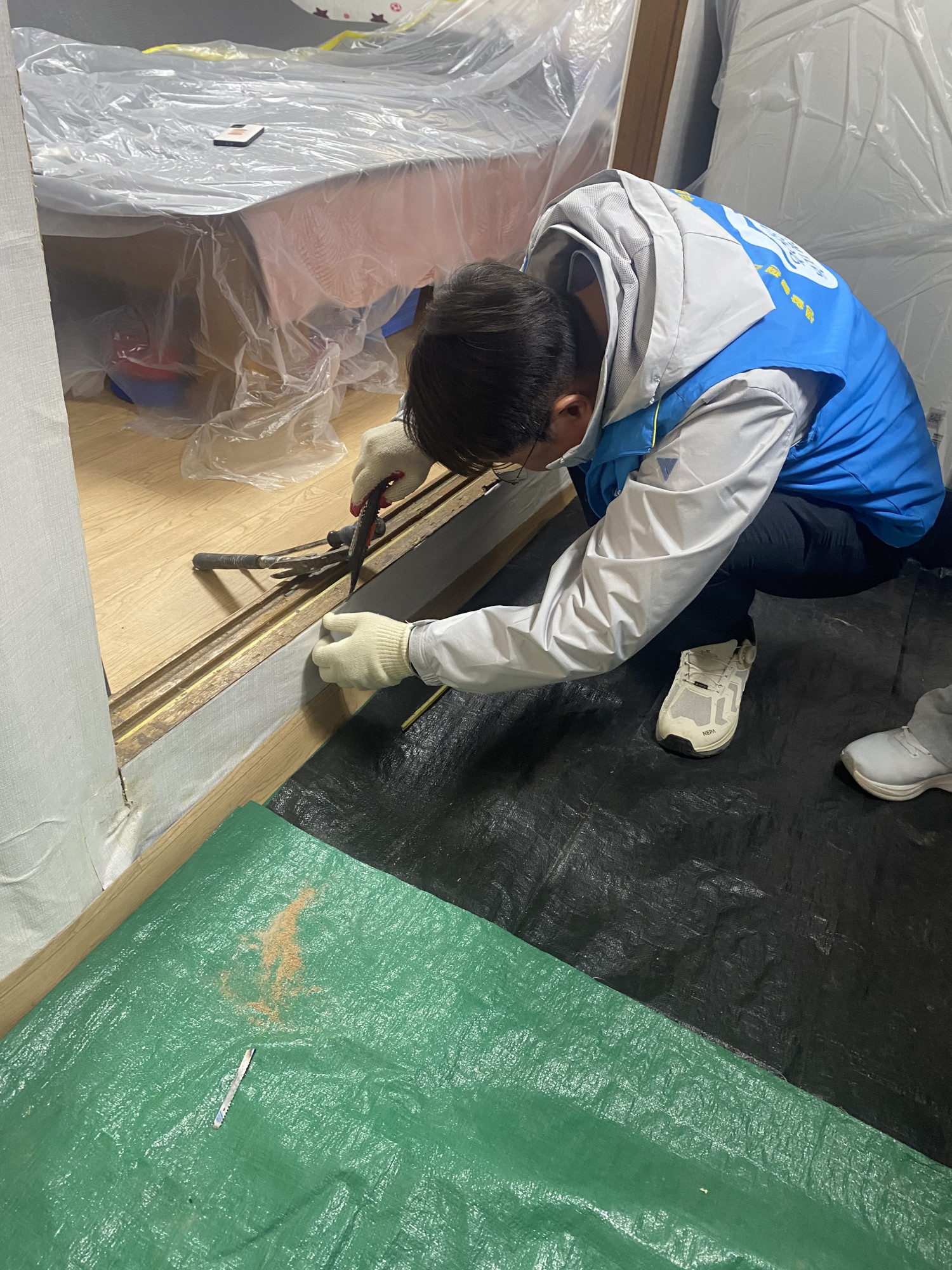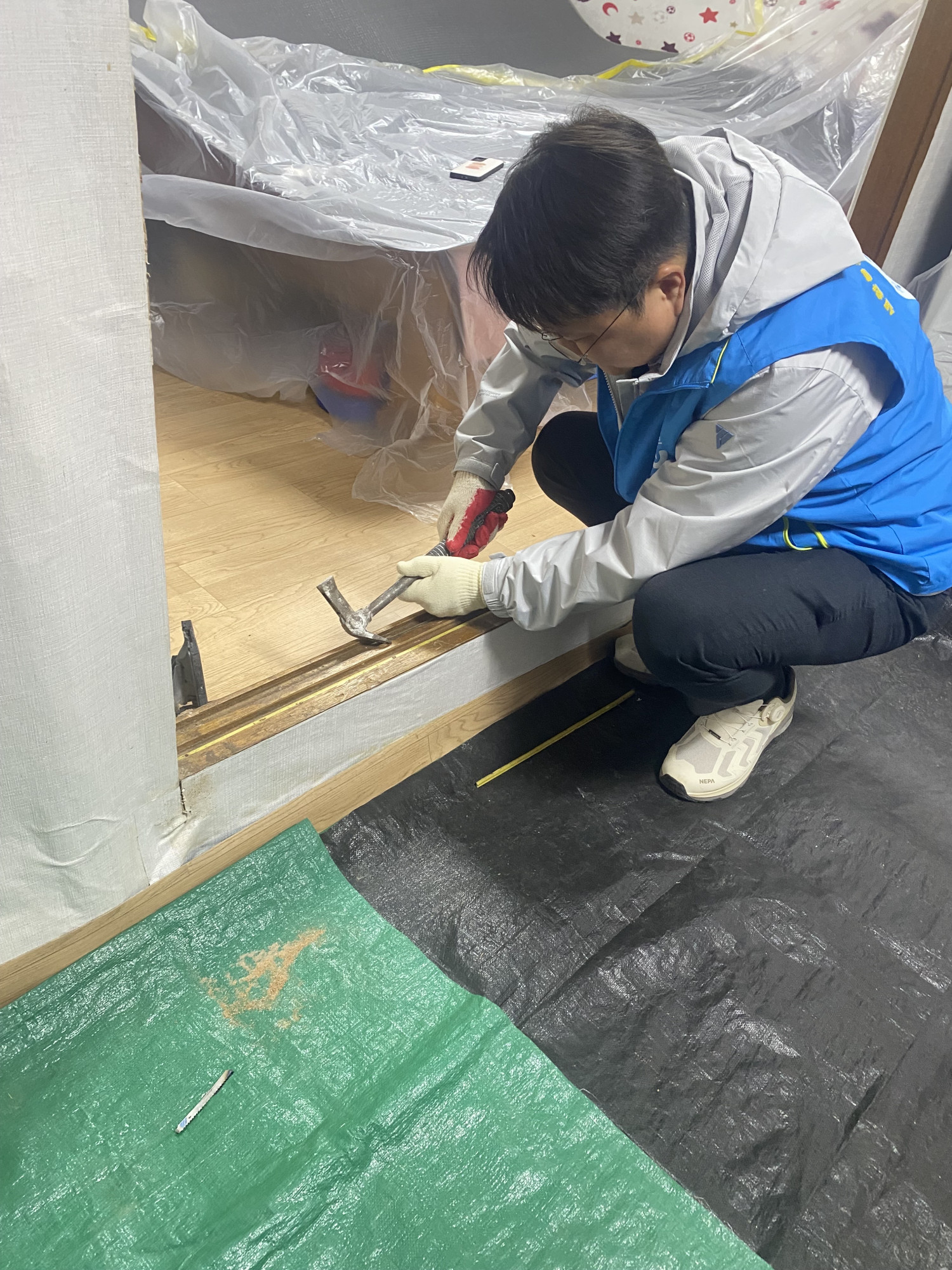 묵직한 자재를 옮기고, 오래된 벽지도 시원하게 뜯어내고 오랫동안 발을 괴롭혔던 문턱의 못 하나까지 세심하게 제거하는 등 현장의 열기가 뜨거웠는데요!