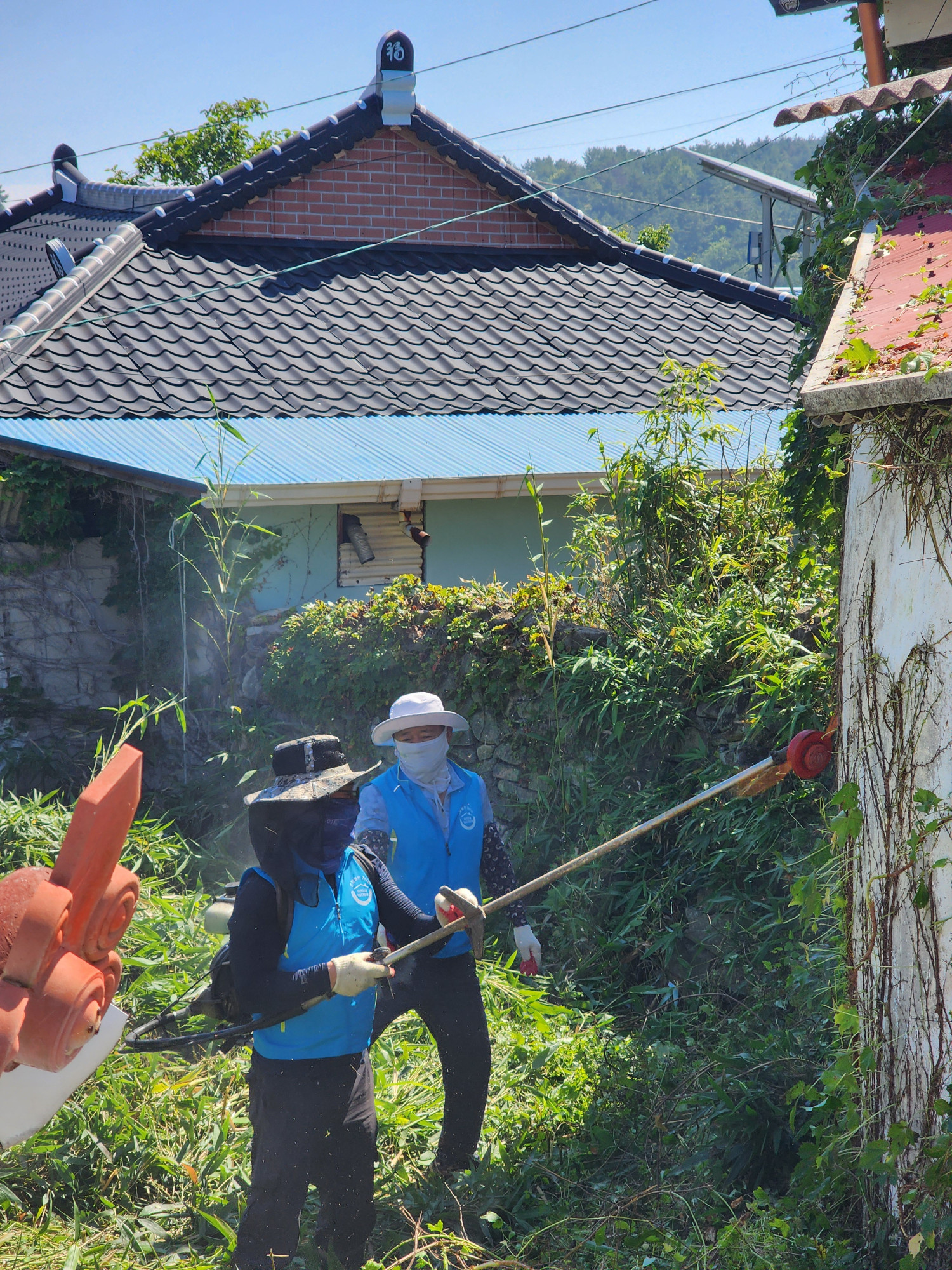 뭉쳐야 뜬다! 돌산읍 우리동네 복지기동대 한여름 구슬땀 흘리며 청소 봉사 실시했습니다. 7월 초 복지사각지대 발굴 활동을 하던 기동대원께서 뇌병변 중증장애로 와상상태이신 어르신의 집을 방문하니 주택 옆 공터에서 부터 담쟁이 넝쿨과 잡초가 자라 벽을 타고 넘어오는 바람에 각종 벌레와 벽의 균열로 불편한 생활을 하고 계신것을 발견했습니다.