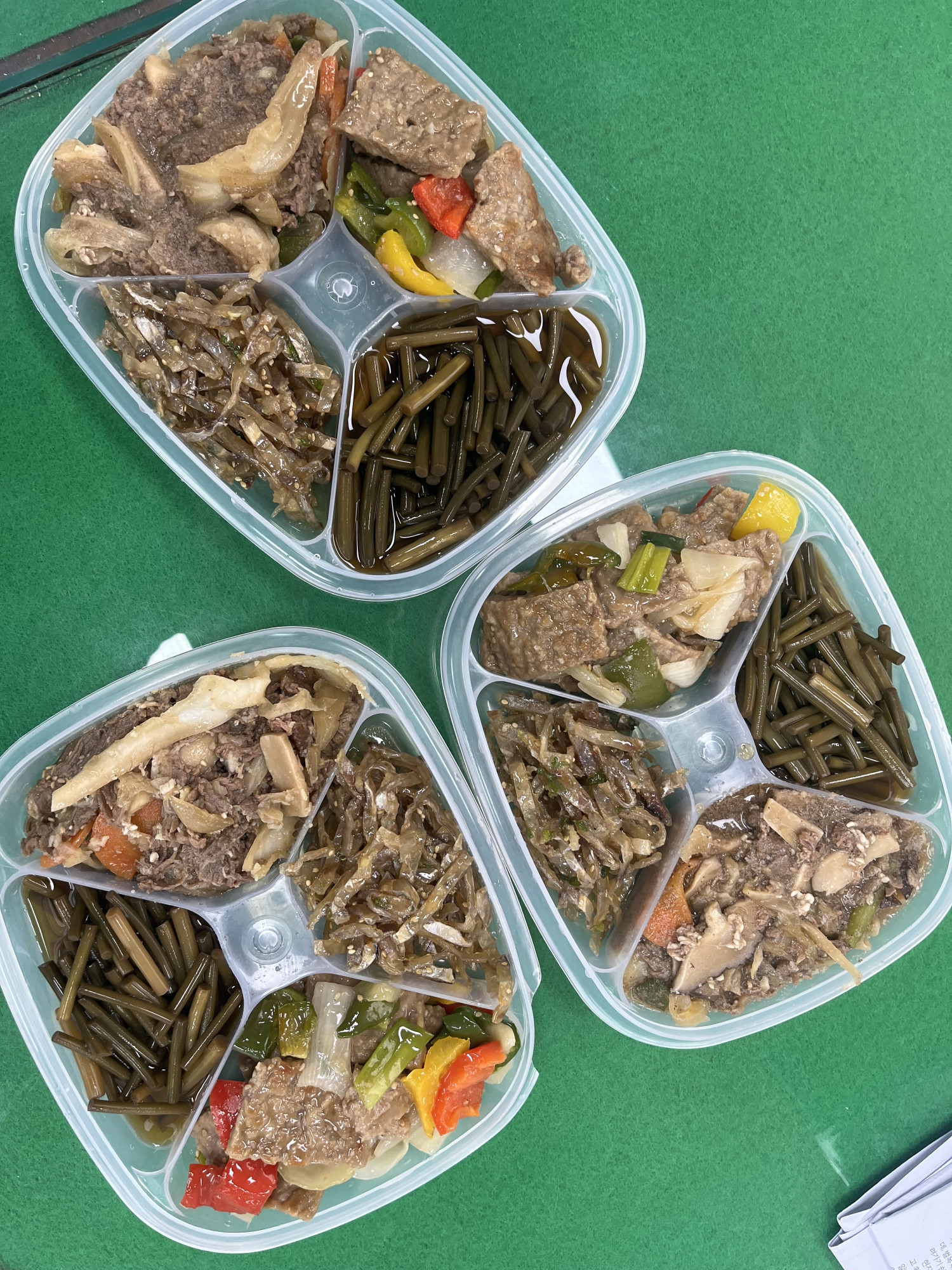 이번주 반찬은 너비아니 야채볶음, 소불고기볶음, 마늘쫑장아찌, 쥐포채간장볶음입니다☺️☺️