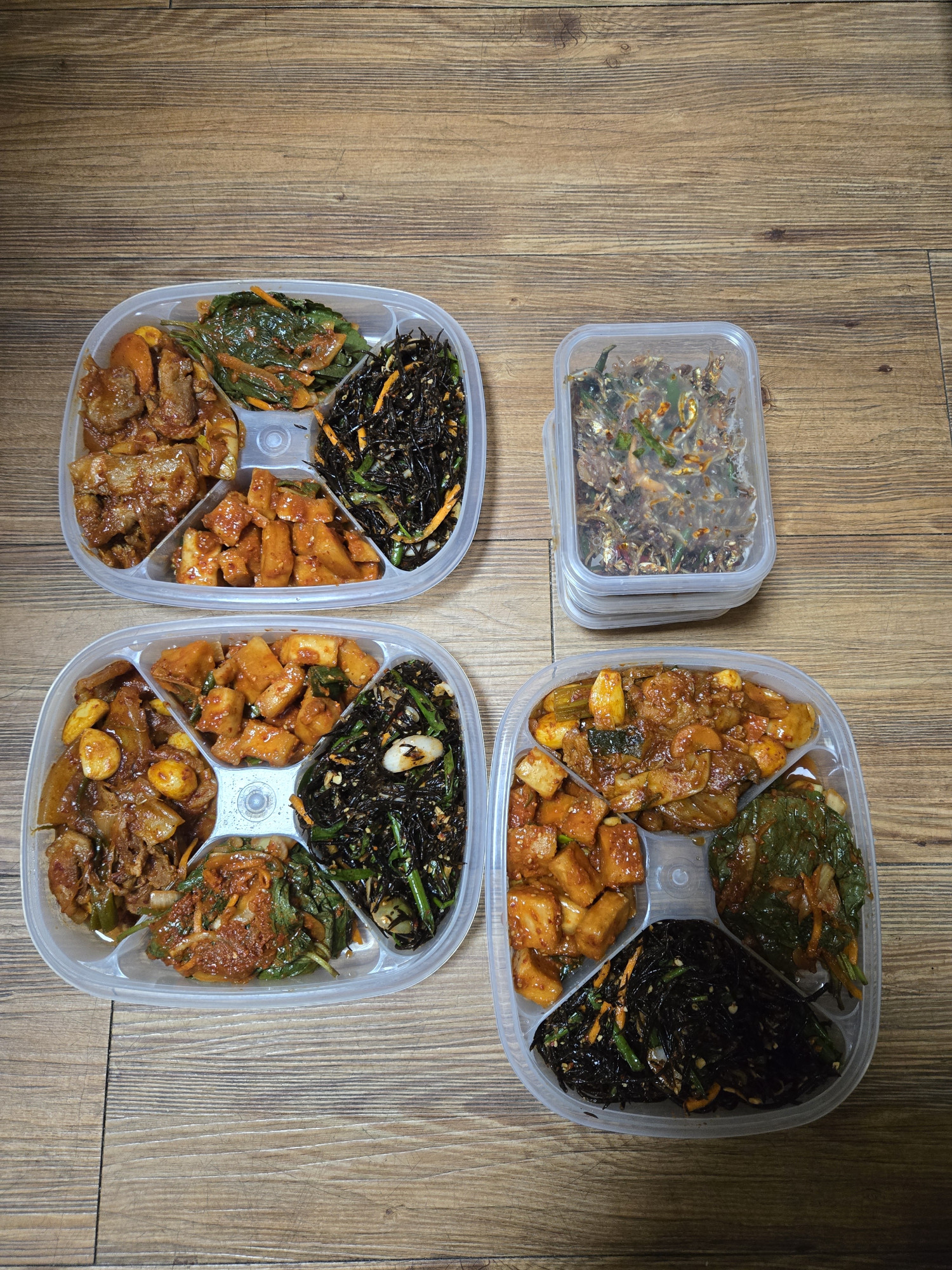 이번주 반찬은 제육볶음, 깍두기, 파김치, 멸치볶음입니다☺️☺️