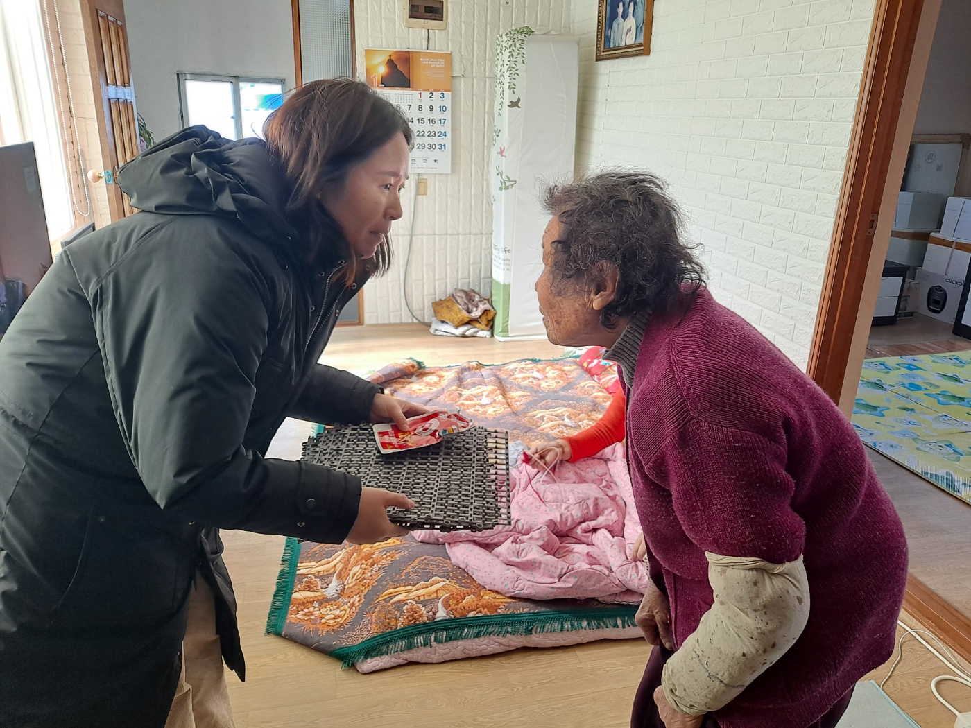 복지기동대와 119생활안전순찰대가 독거어르신(10가구) 집을 함께 방문하여 난방시설, 주택화재예방 점검 등 안전교육을 실시하였습니다. 또한 안전꾸러미(화재감지기 설치, 가정용소화기, 산소발생마스크, 미끄럼방지매트)를 지원하여 추위에 따른 건강 유의 및 미끄럼, 낙상 예방 안내를 하였습니다.