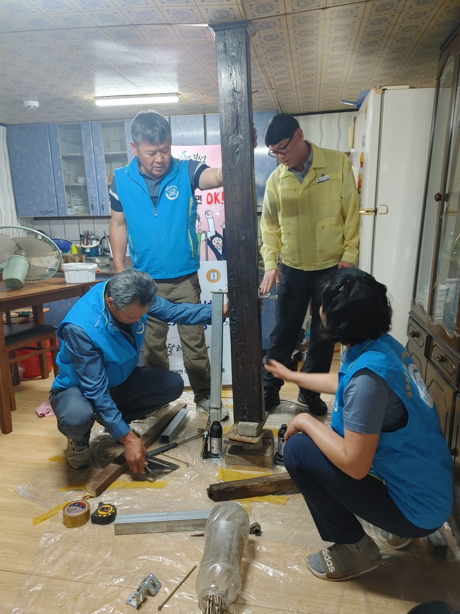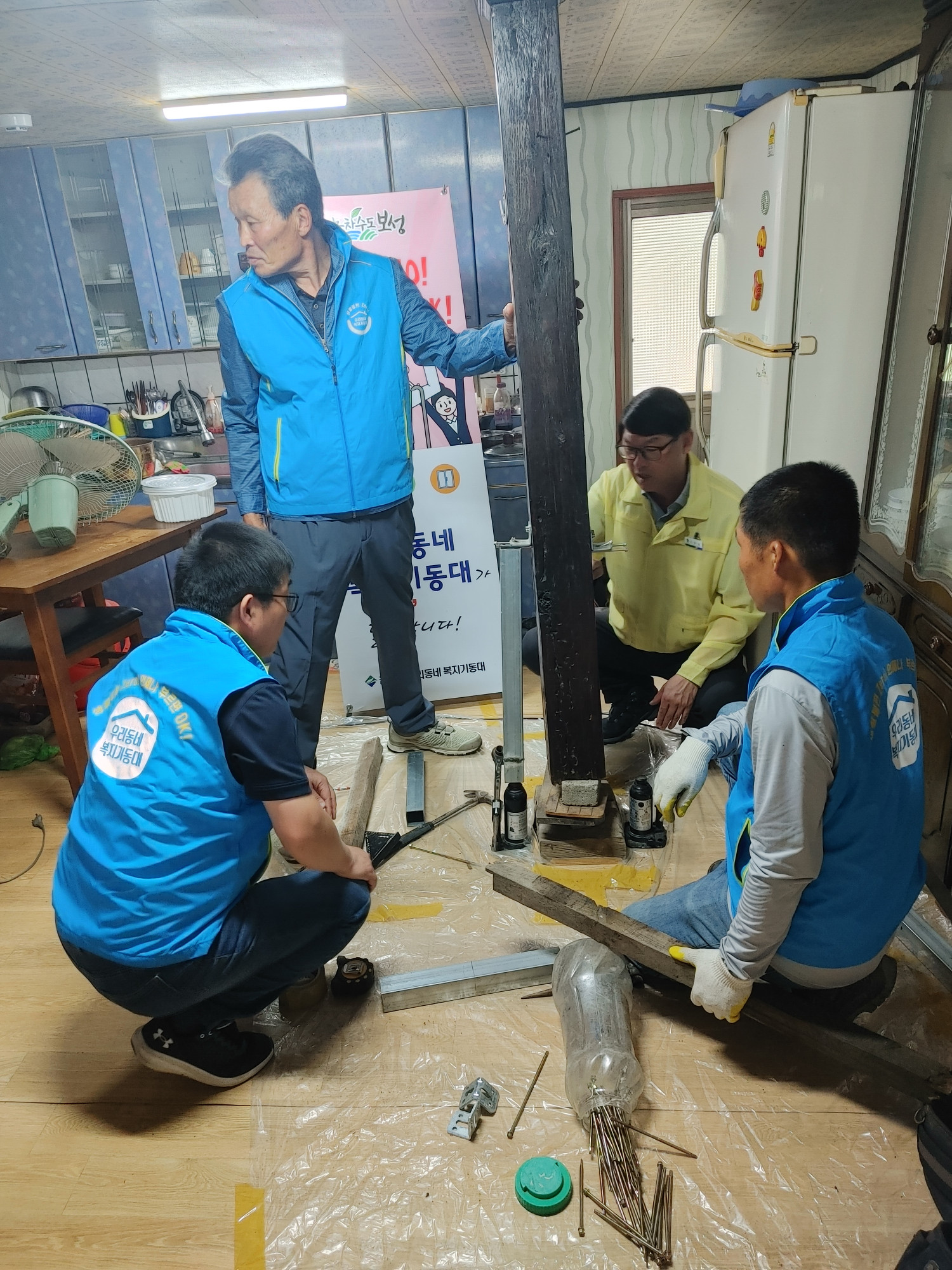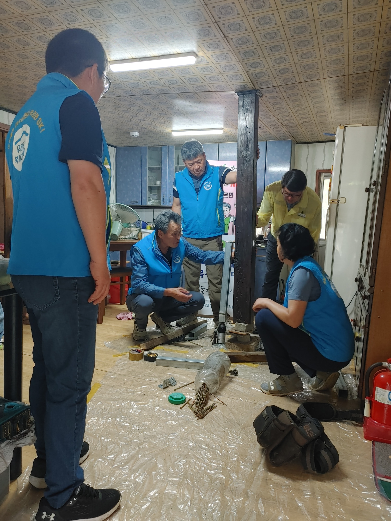 내용: 율어면 우리동네복지기동대는 율어면 고0리 독거어르신 댁에 집내부 기둥이 흔들거려 기동대장님과 함께 가서 기둥을 보수하여 주거내부환경개선에 일조하였다.