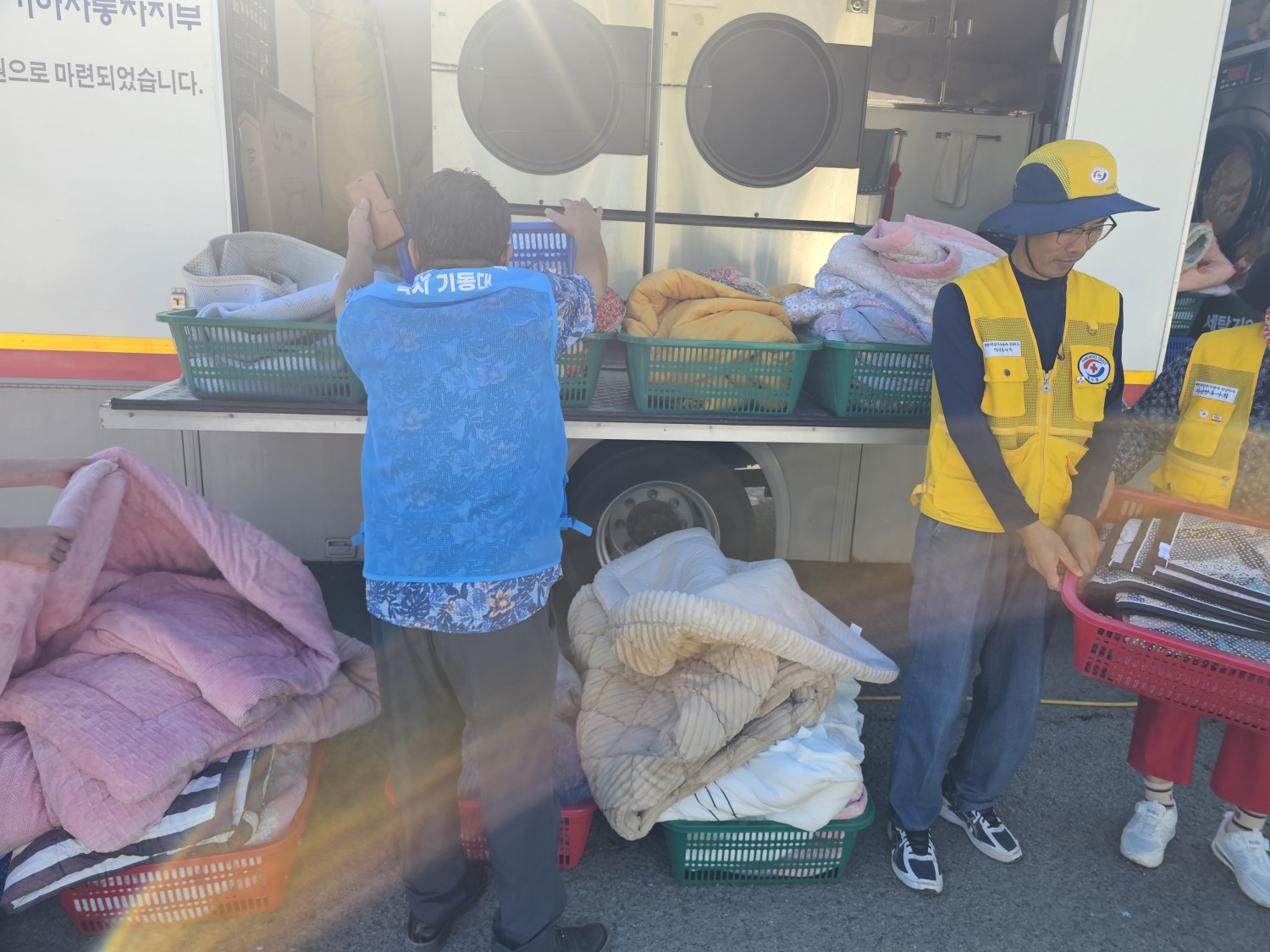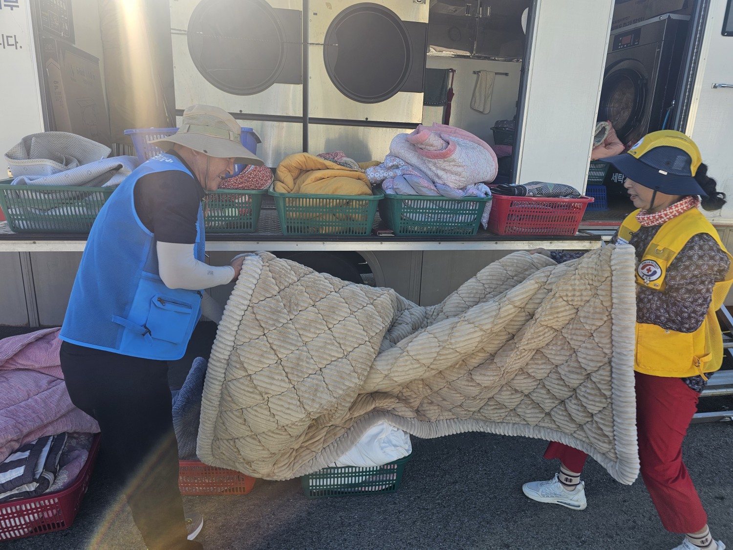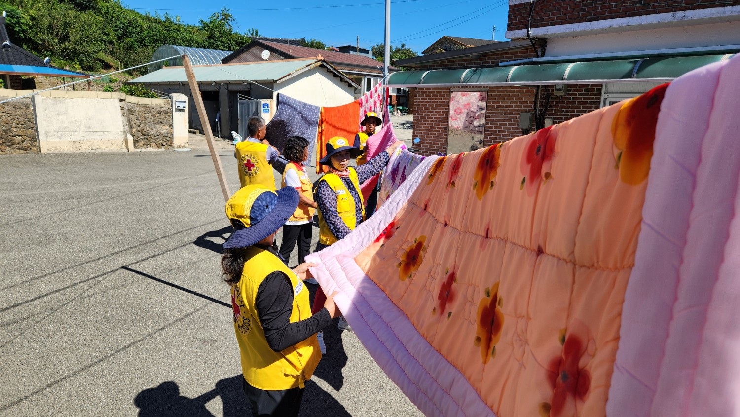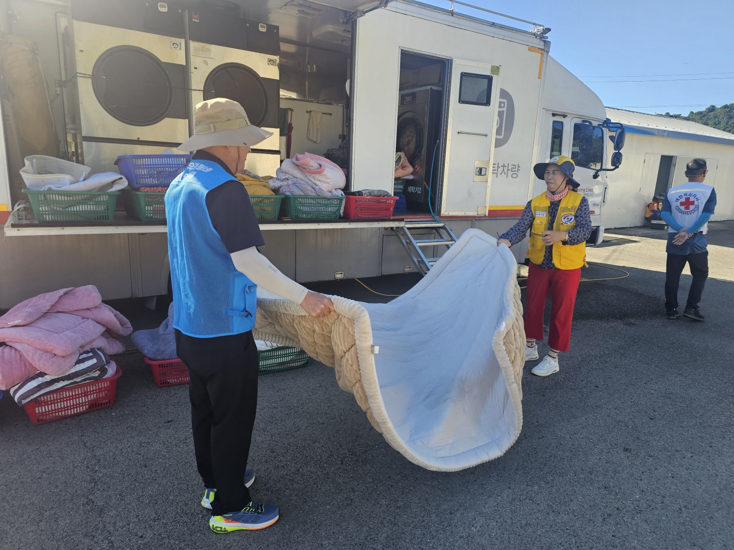 적십자 회원들과 복지기동대원들이 함께 이불세탁을 하고 뽀송하게 햇빛에 말려 각 가정에 배달하는 뜻깊은 하루를 보냈다.