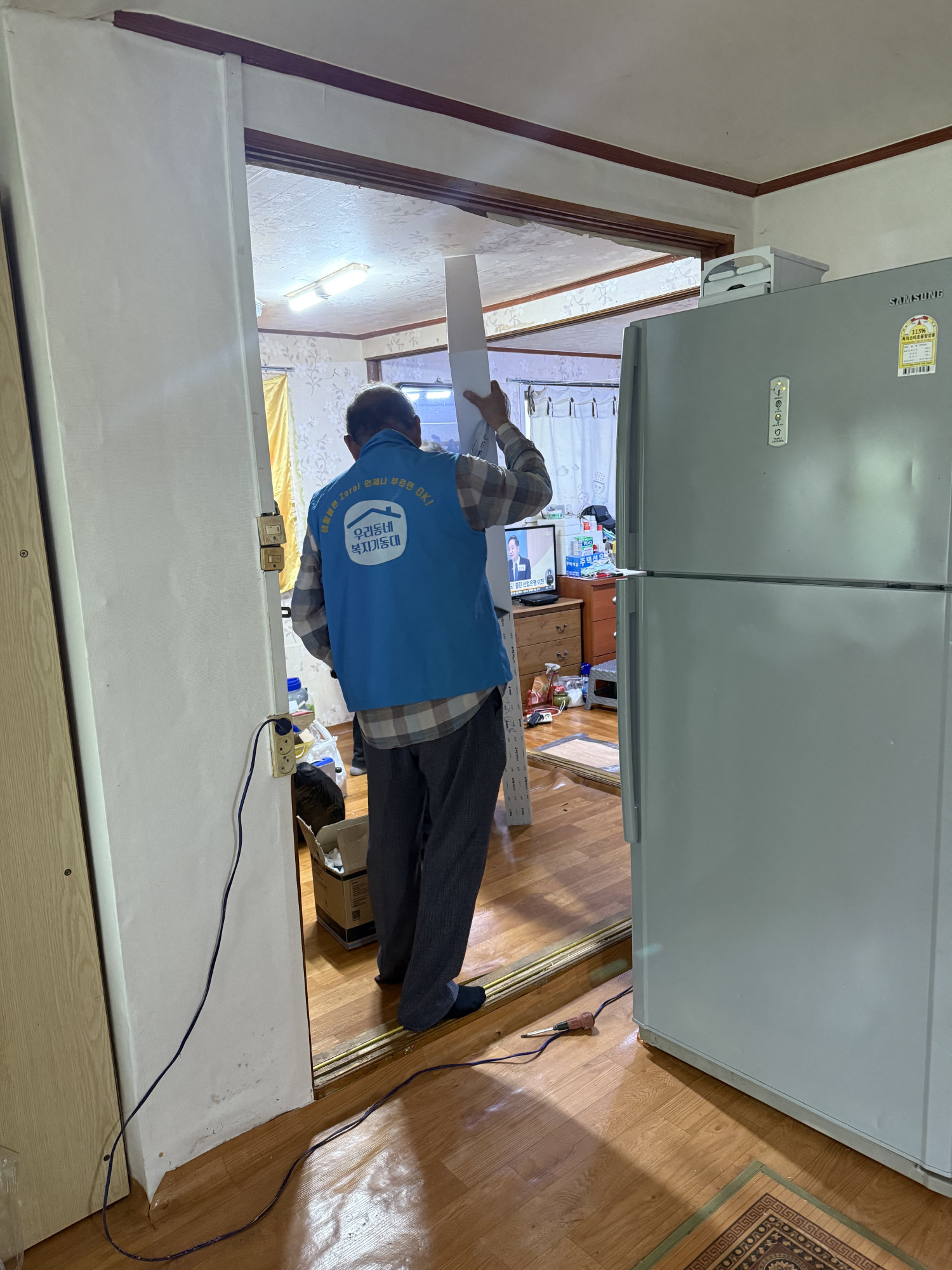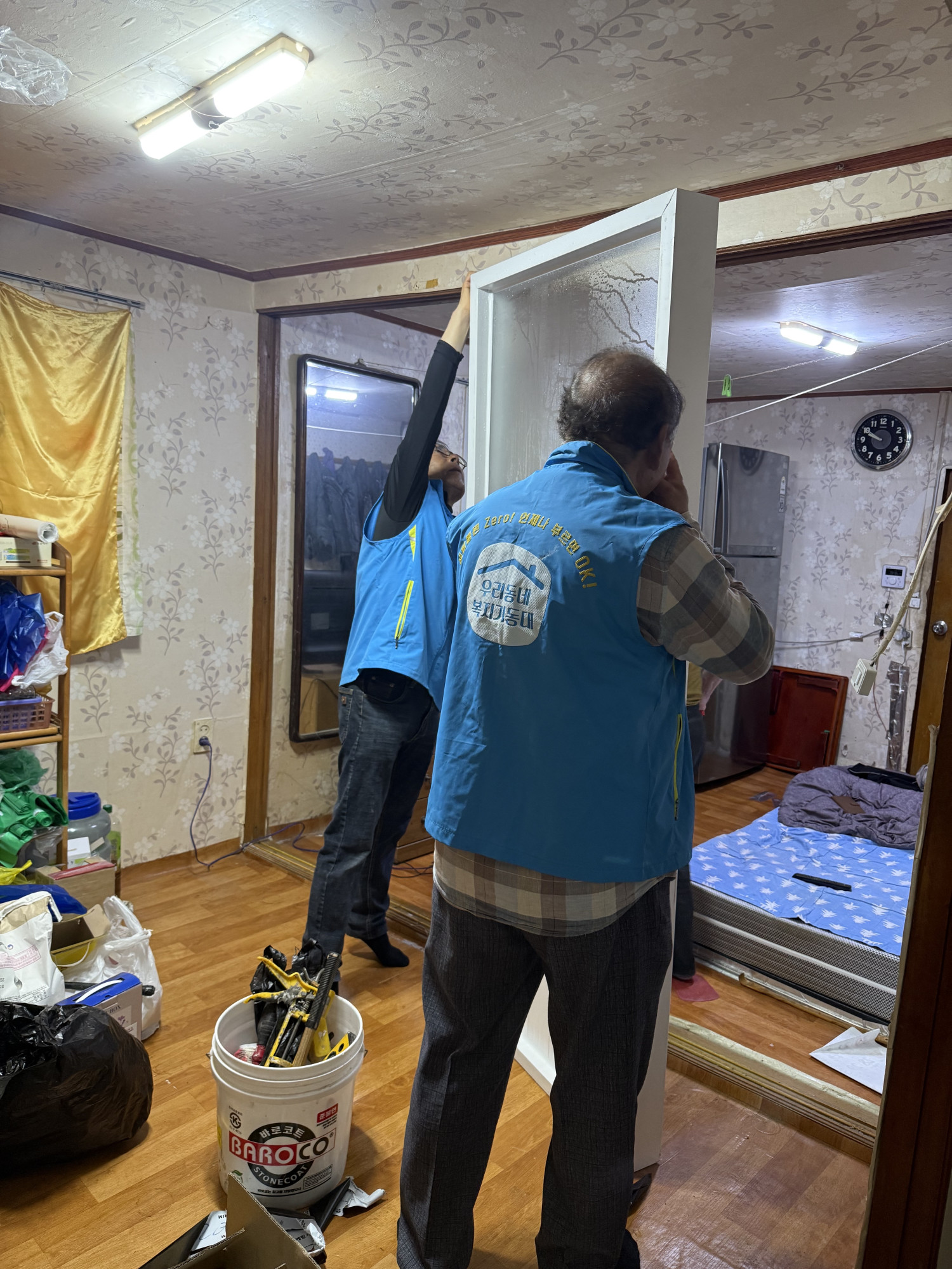 깨끗해진 거실, 안방 문으로 탈바꿈하여 대상자분 만족해하시고, 크게 기뻐하셨습니다.😊