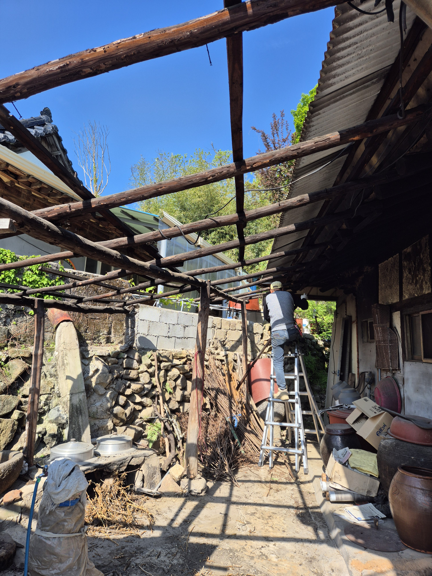송광면 우리동네 복지기동대가 이읍마을 어르신의 불편사항 해소를 위해 비새는 수돗가 지붕을 철거하고 새로운 비가림을 설치해드렸다