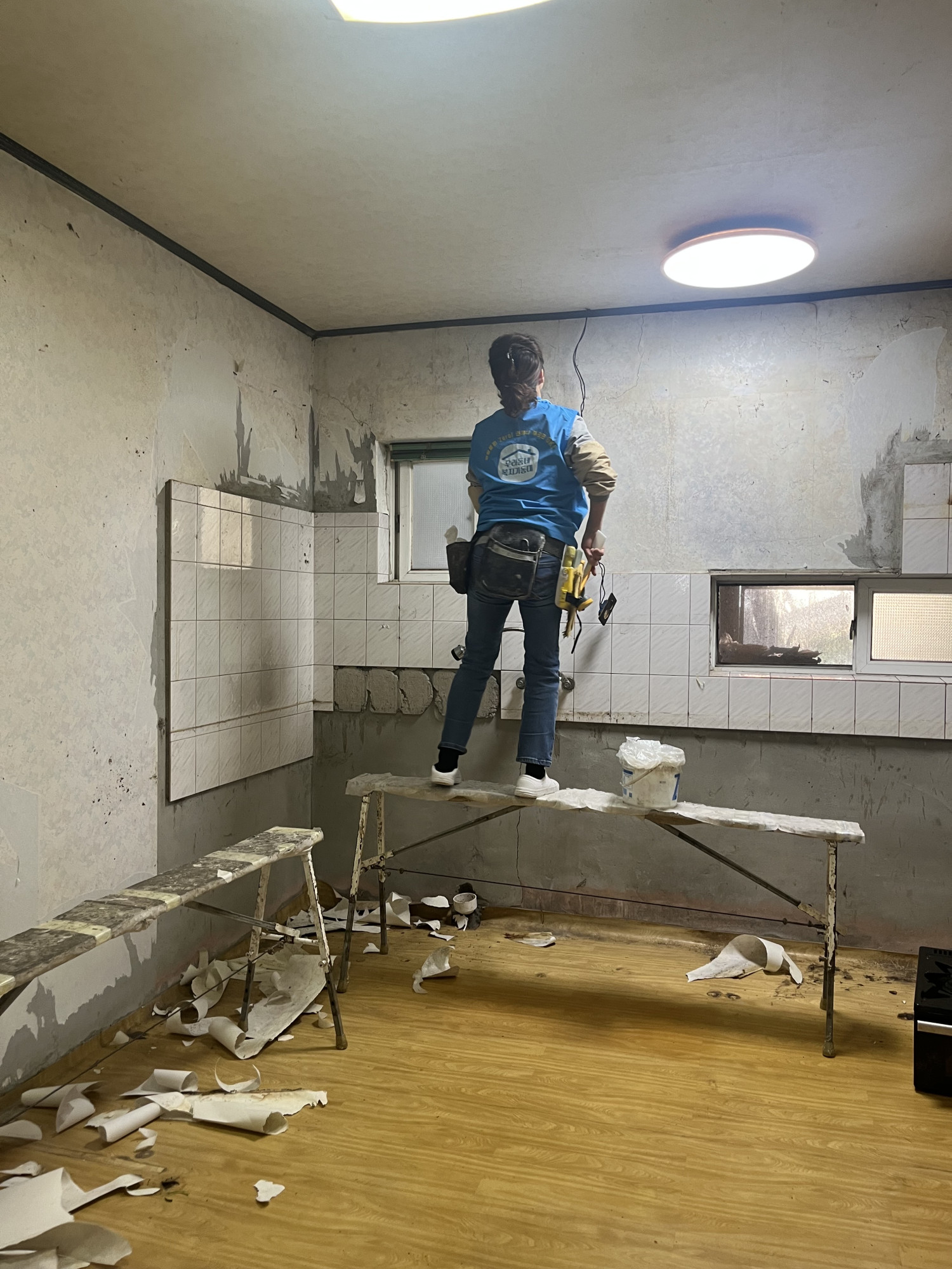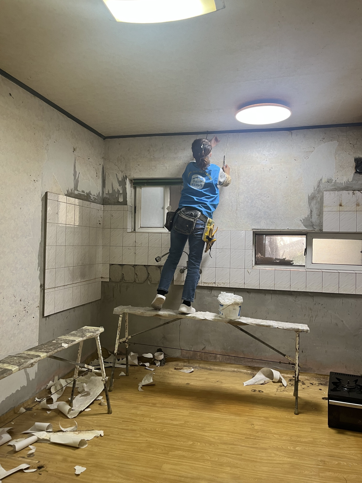 싱크대를 모두 철거한 부엌은 휑~ 한 빈 상태여서 대상자의 식사를 위해 이른 아침부터 도배, 장판을 시작했어요