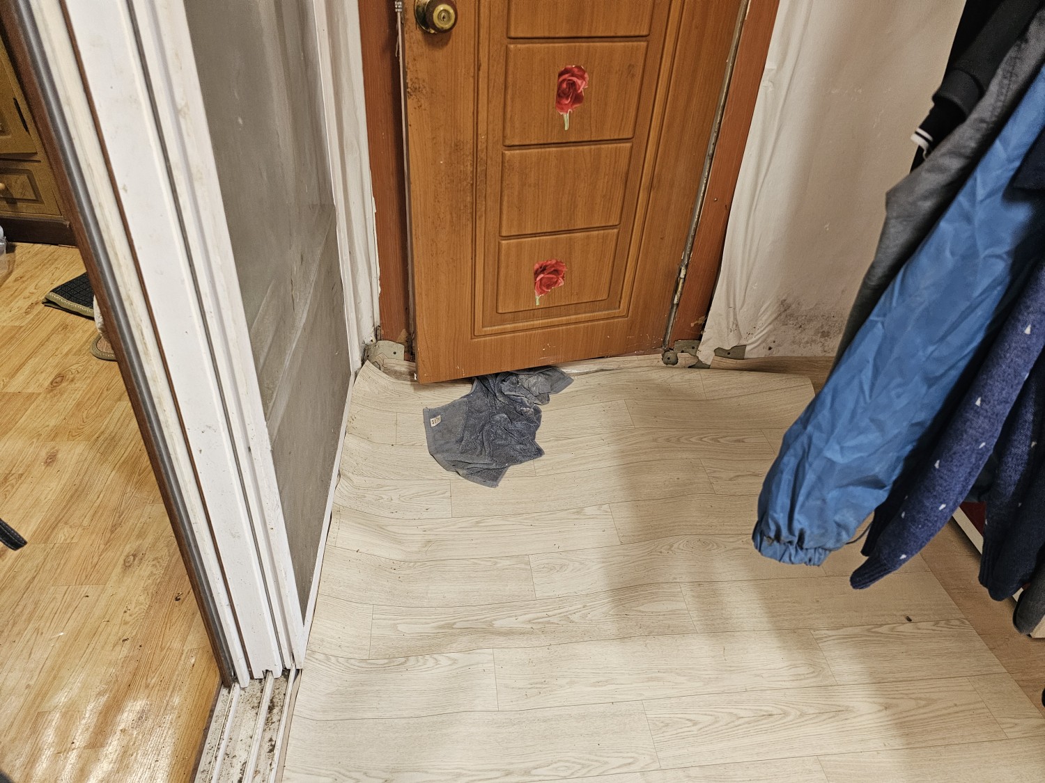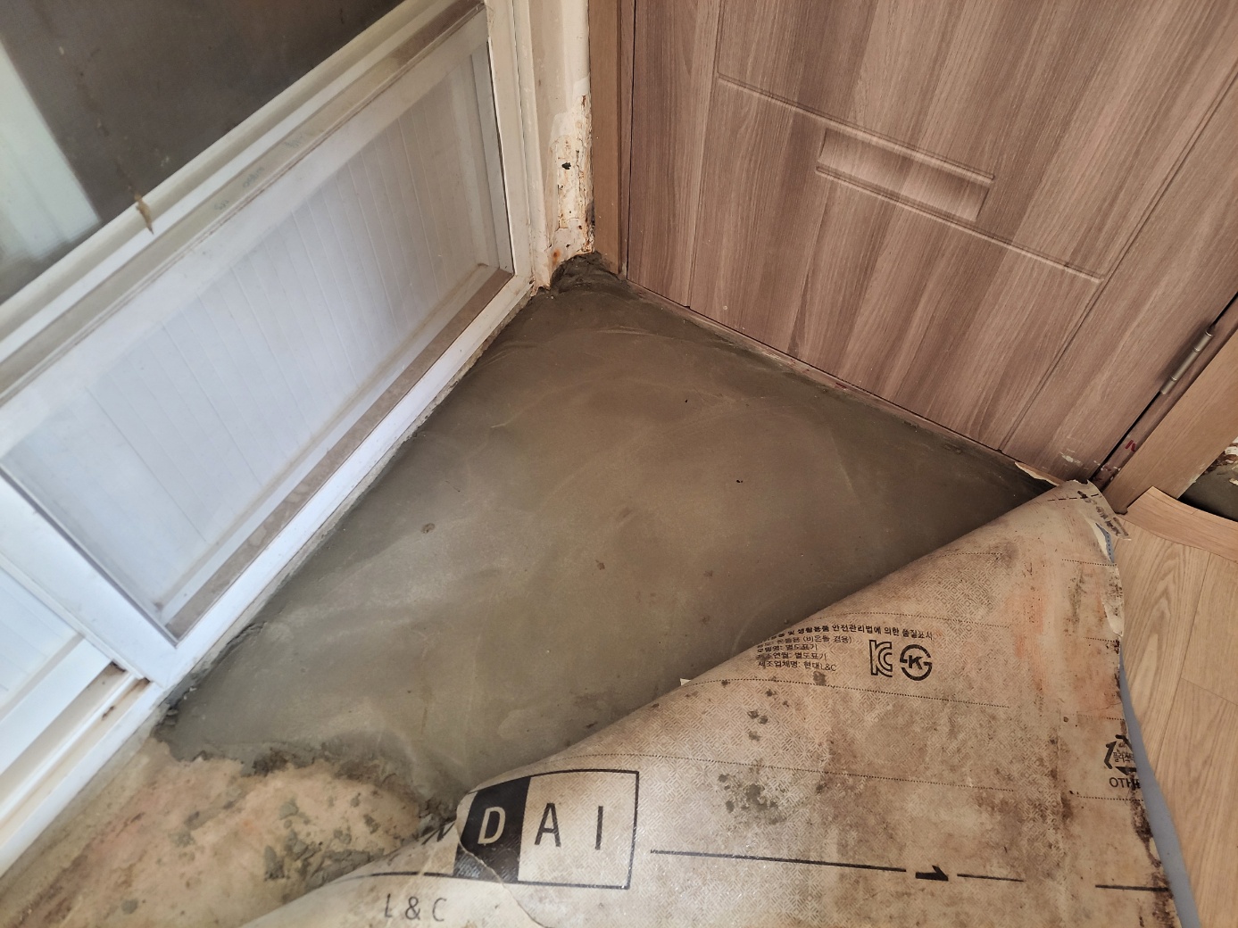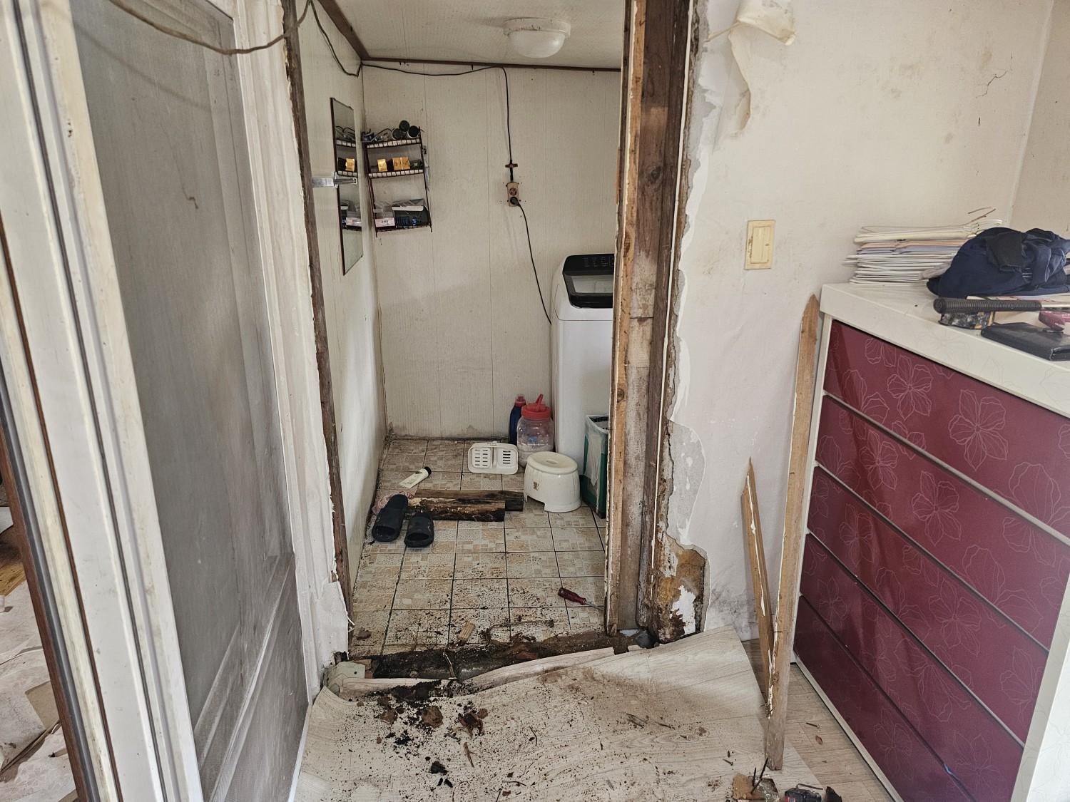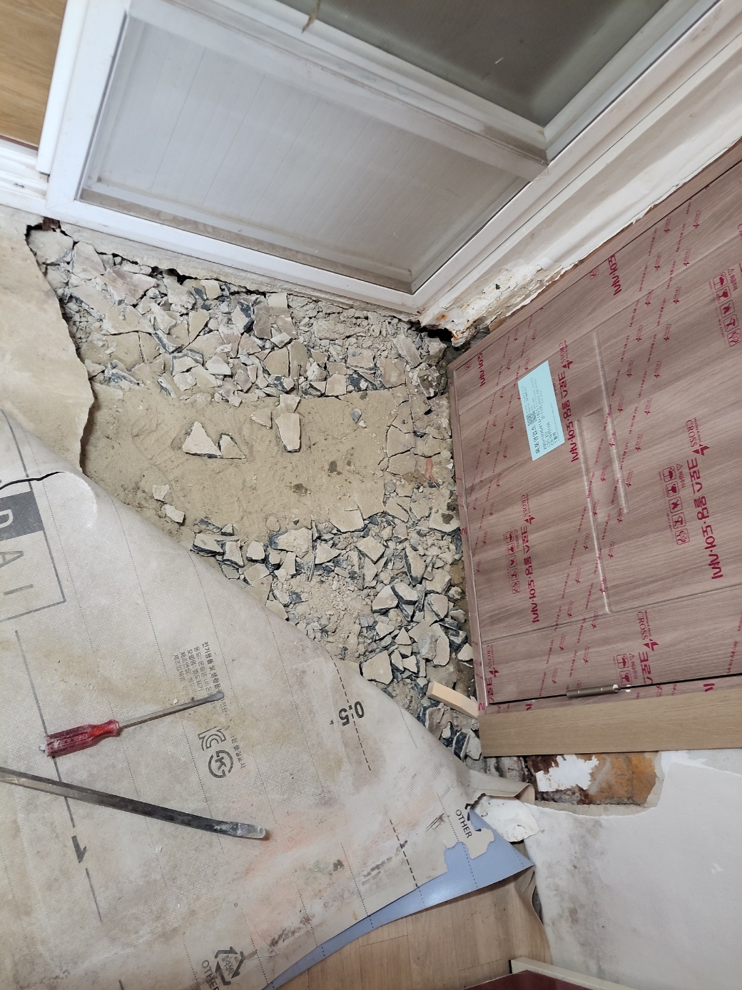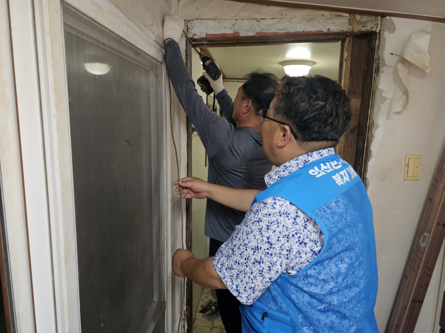 -지원결과 : 오래된 문을 뜯어내고 새로운 문으로 교체하고, 깨져서 내려앉은 입구를 보수했으며, 화장실앞 내려온 전기선을 고정시켜드림.