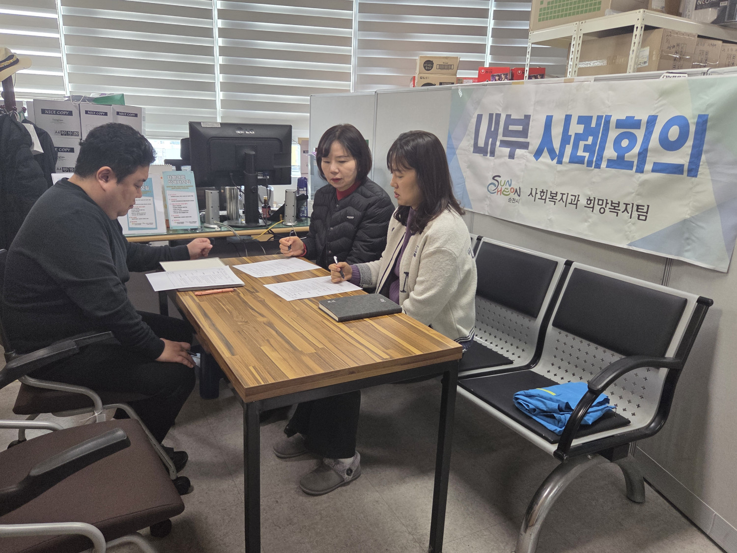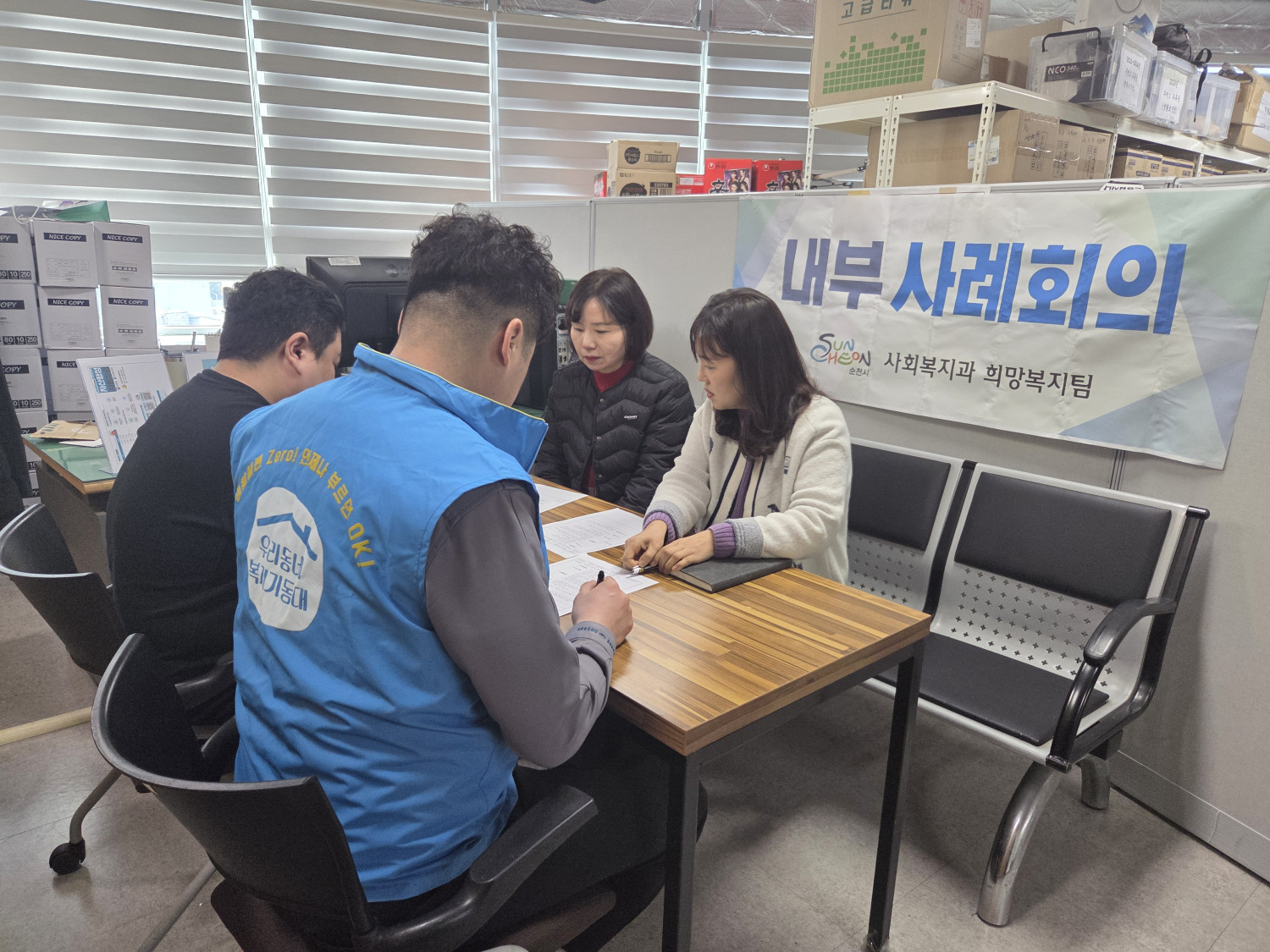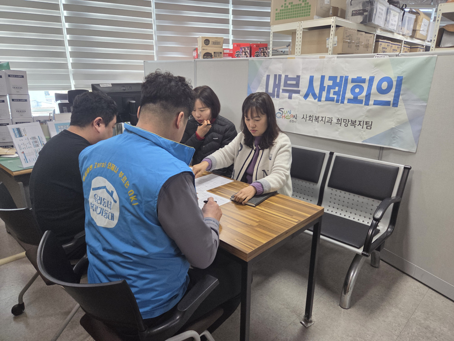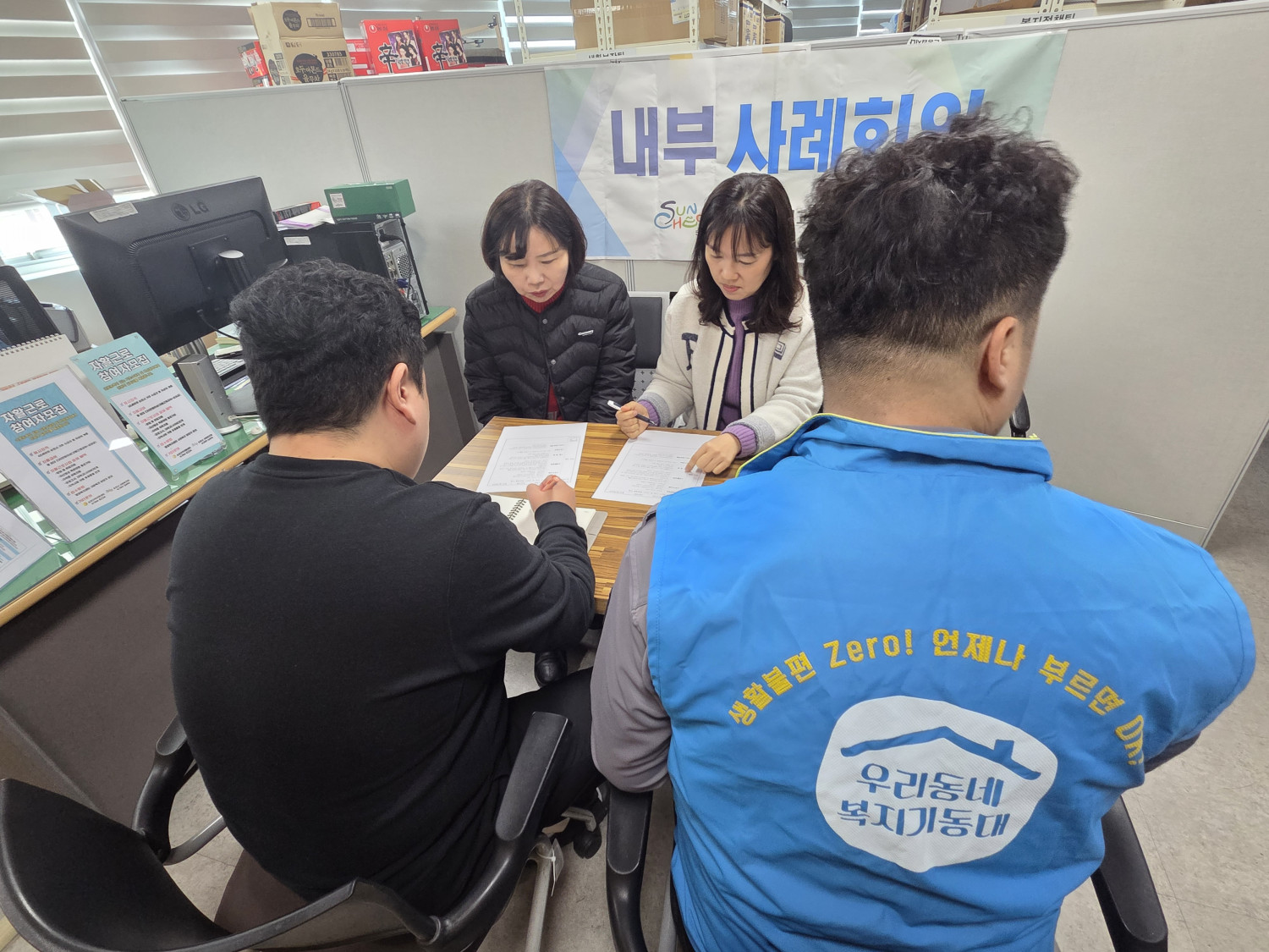 장소 : 시청 별관 소회의실 참석 : 희망복지팀장 외 3명(복지기동대원 참석) 내용 : 복합적 복지 욕구를 지닌 대상자의 문제 해결계획 수립 •(사례1) 알코올 의존 및 폭력 전과가 있는 1인 가구주로, 가족과의 단절 및 주거 불안정으로 지속적인 입원치료와 공적 급여 관리 필요. •(사례2) 본인(심한 장애)과 자녀(장애) 양육중인 3인 가구로, 배우자와 별거로 인한 경제적 빈곤 및 돌봄 공백 심각. 기초수급 책정 및 장애인 활동지원 서비스 연계 시급.