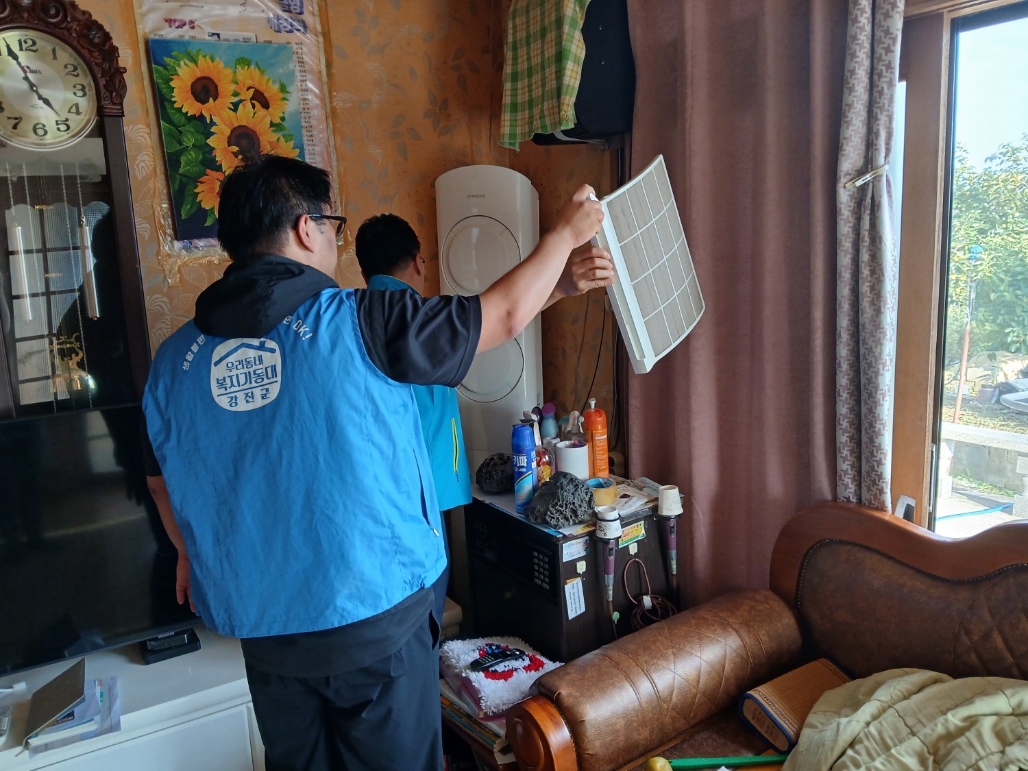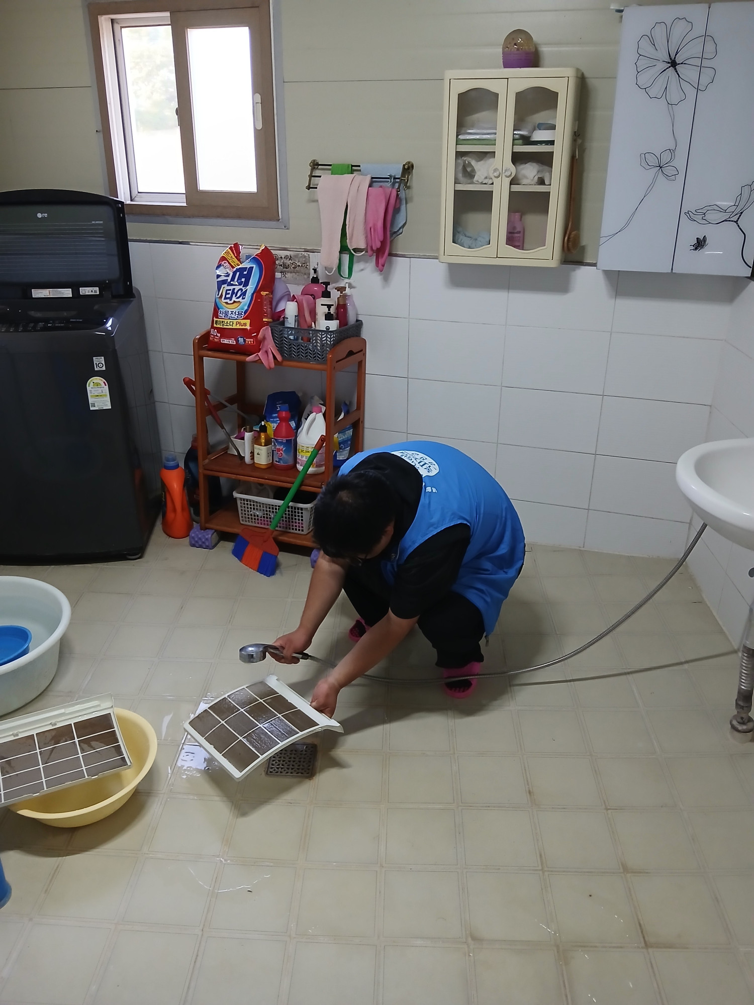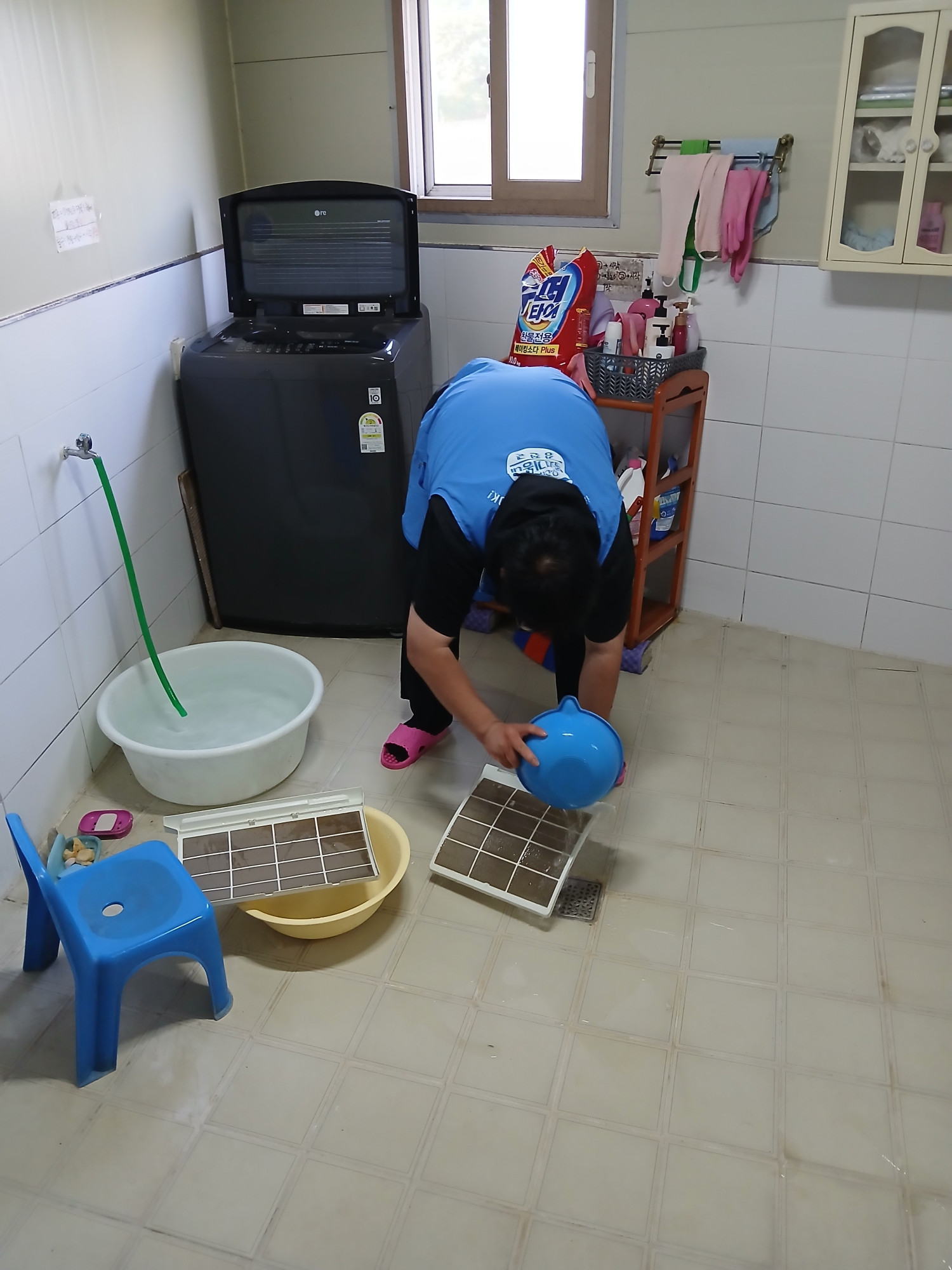 혼자 에어컨 필터 청소가 어려우신 어르신들 댁에 방문하여 에어컨 청소를 해드림