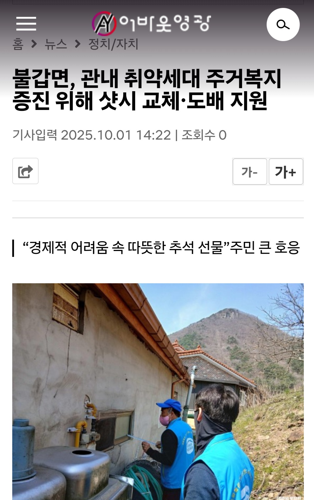 불갑면에서는 주거취약계층세대를 방문하여 주거점검을 하였으며, 이에따라 노후샤시교체, 도배장판교체등 주거환경개선을 하였다. 주거개선은 취약계층의 삶의 질 향상에 기여하며, 불갑면에서는 주거복지사각지대에 있는 취약계층을 발굴하여 앞으로도 쾌적하고, 안전한 주거환경개선에 최선을 다하겠습니다.