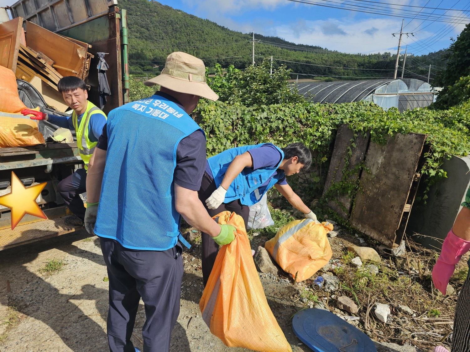 - 결과 : 복지기동대원들이 쓰레기수거 봉사활동에 앞장서서 마당에 쌓인 쓰레기들을 깨끗하게 정리해드려 이장님과 대상자가 매우 감사해함.