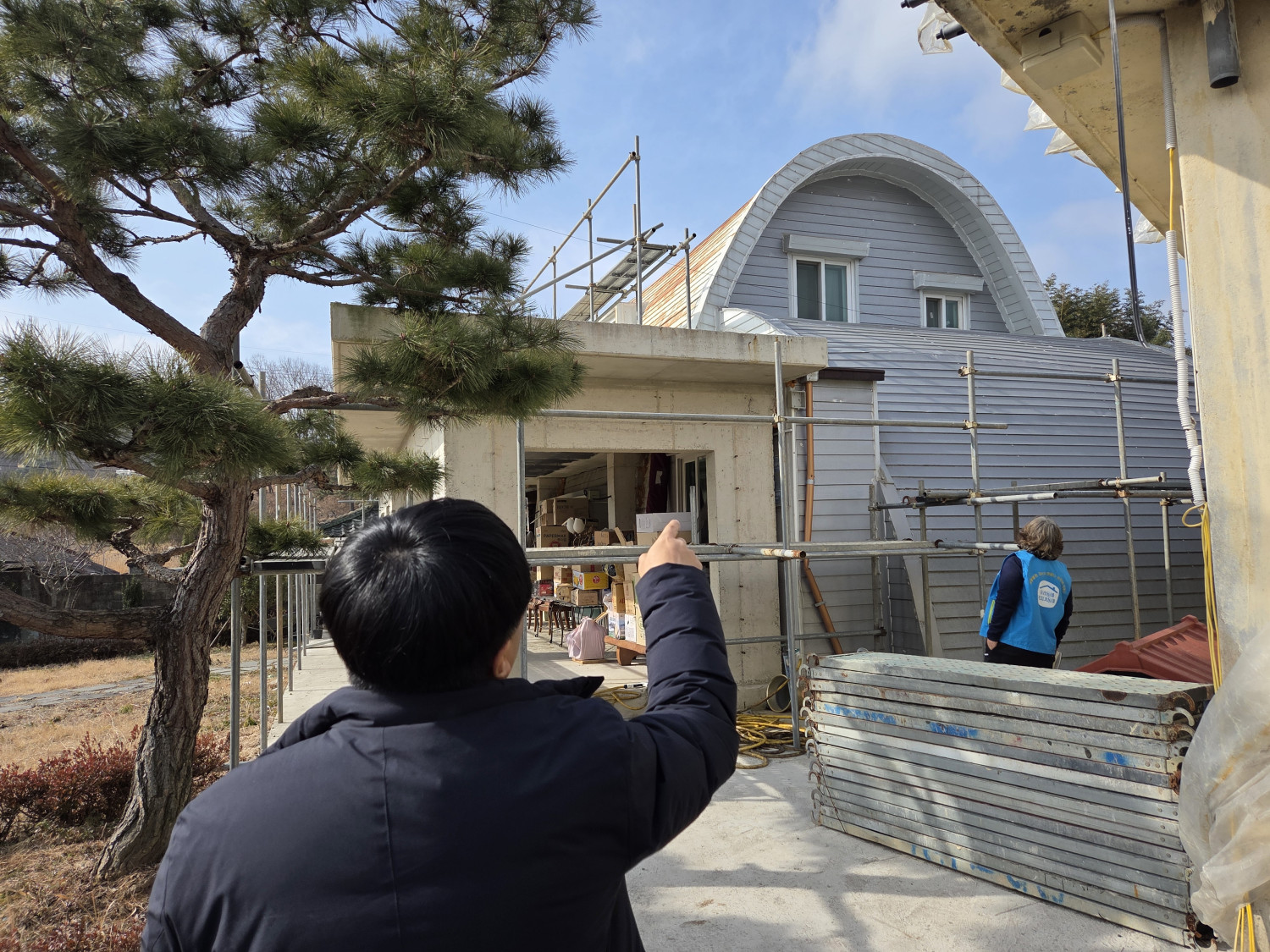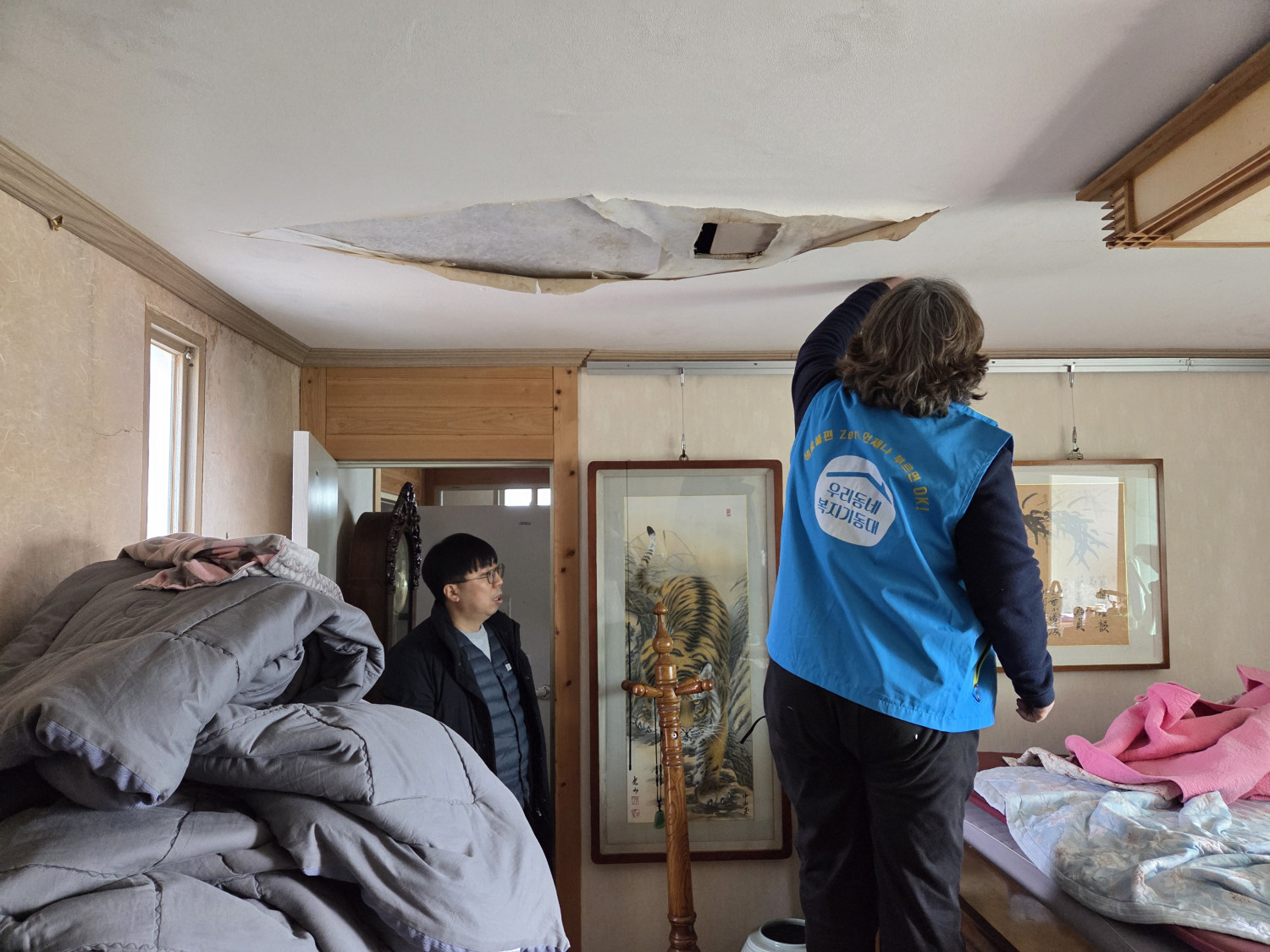 현재 천장에 누수가 발생하여 벽지가 뜨고 구멍이 뚫렸다는 불편사항을 듣고 향후 지원을 검토하였습니다.
