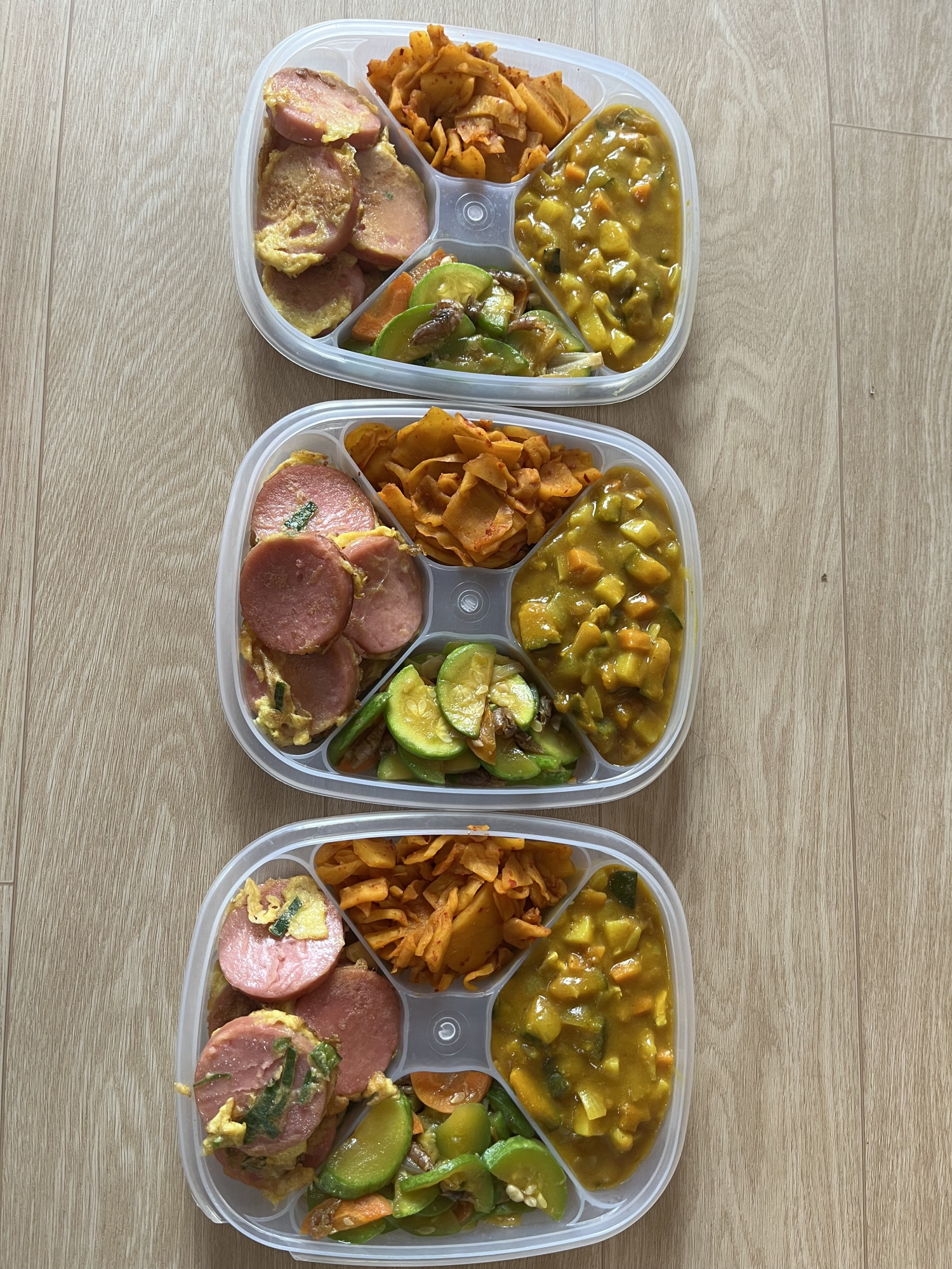 이번주 반찬은 카레, 제육볶음, 단무지무침, 소세지 부침입 니다