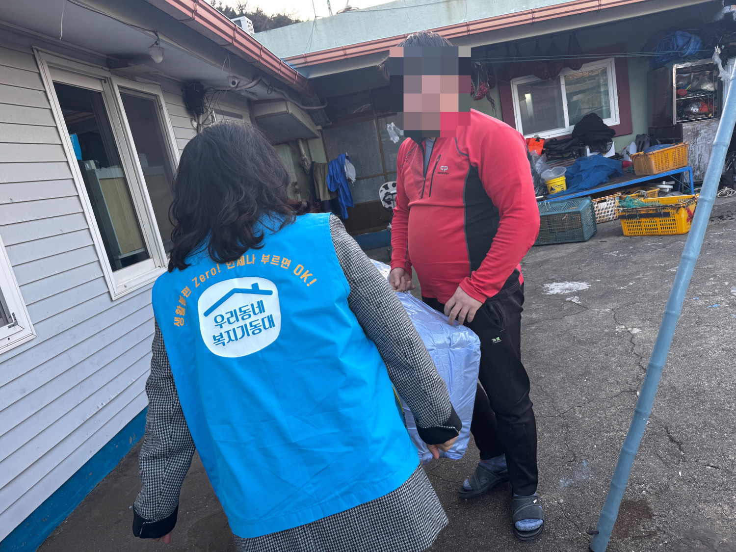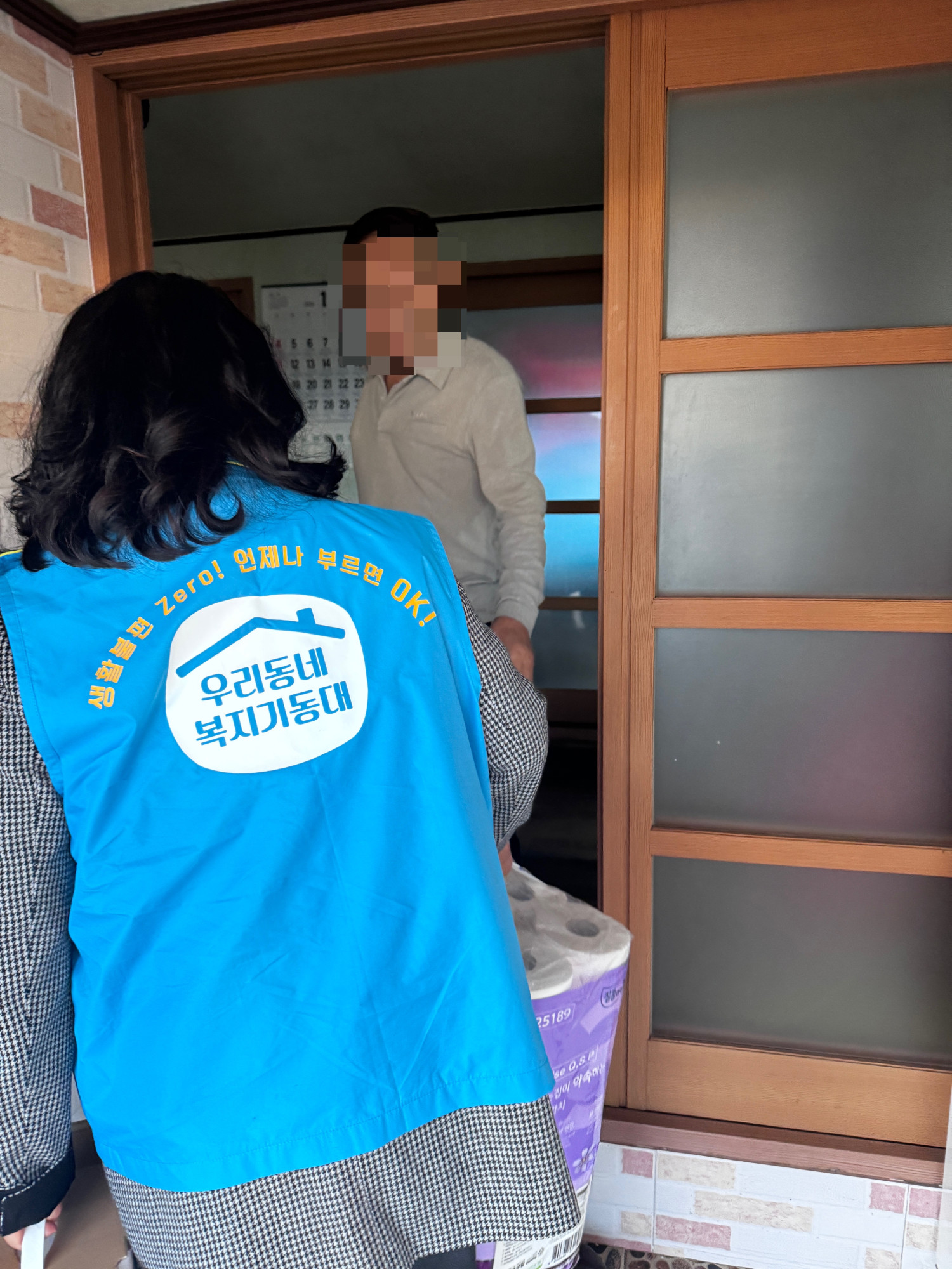 활동내용: 어려운 가정에 복지기동대가 방문하여 안부를 살피고, 생활에 필요한 물품 꾸러미를 전달하며 생활실태를 파악함.