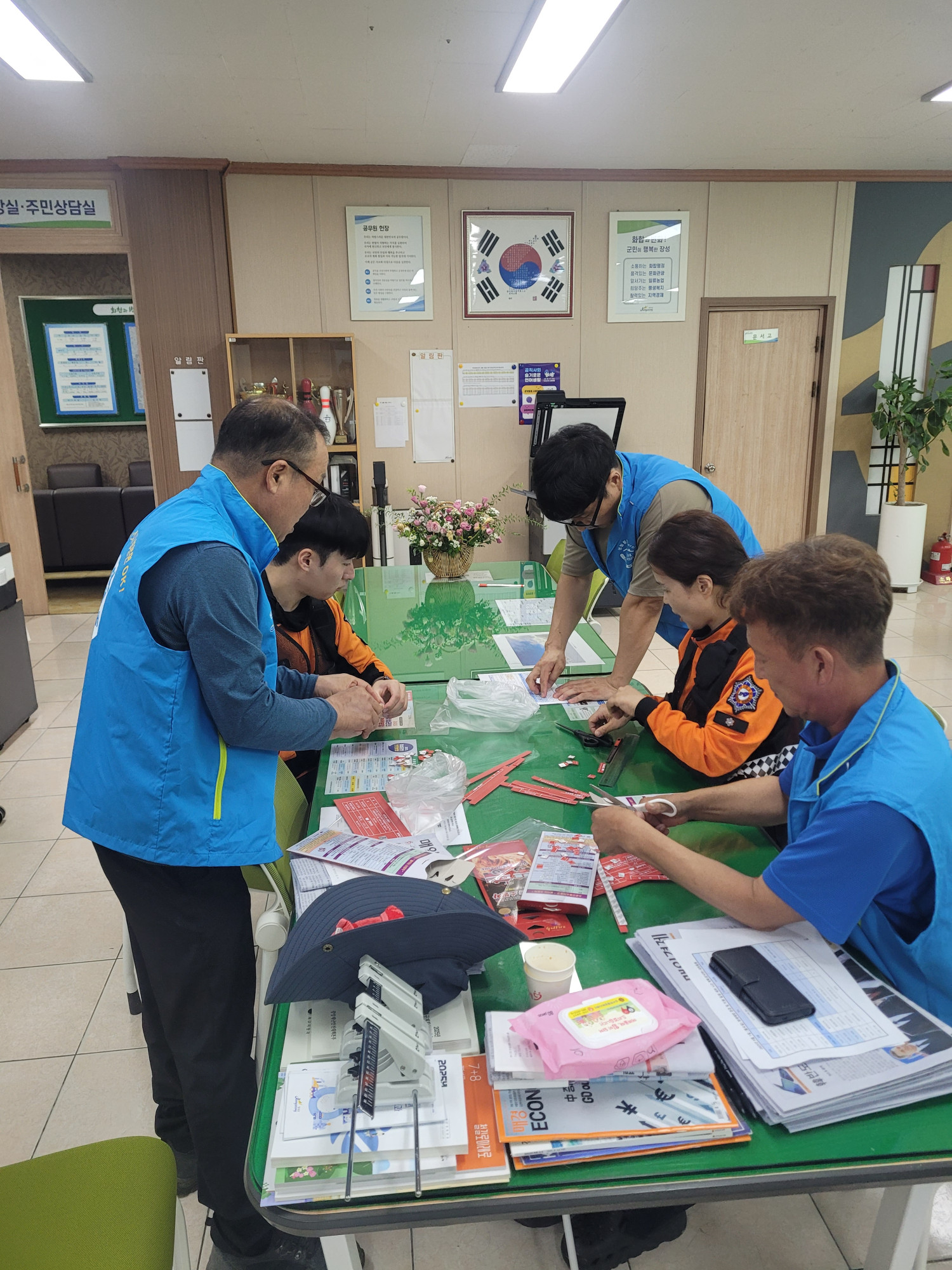 오전 10시 출발 전 복지기동대와 순찰대가 면사무소에 모여 오늘 일정에 필요한 준비물과 주의사항, 기타 세세한 계획들을 마지막으로 점검함.