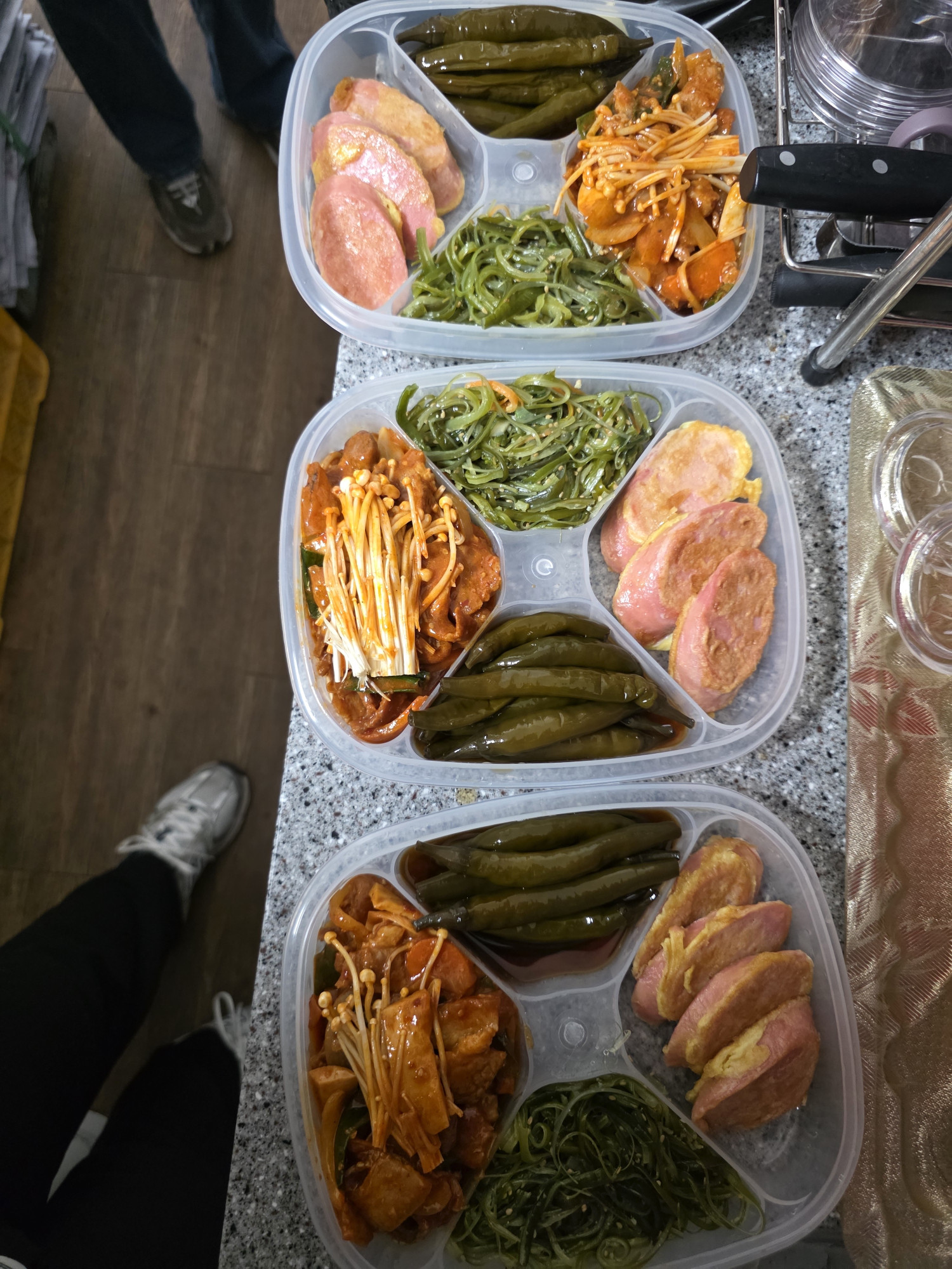 이번주 반찬은 무장아찌, 미역줄기볶음, 제육볶음, 소세지 부침입니다