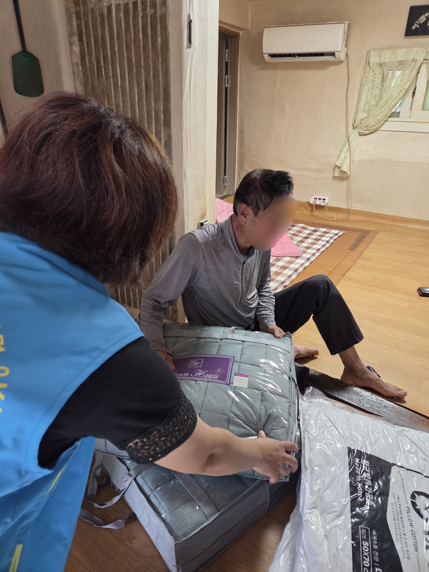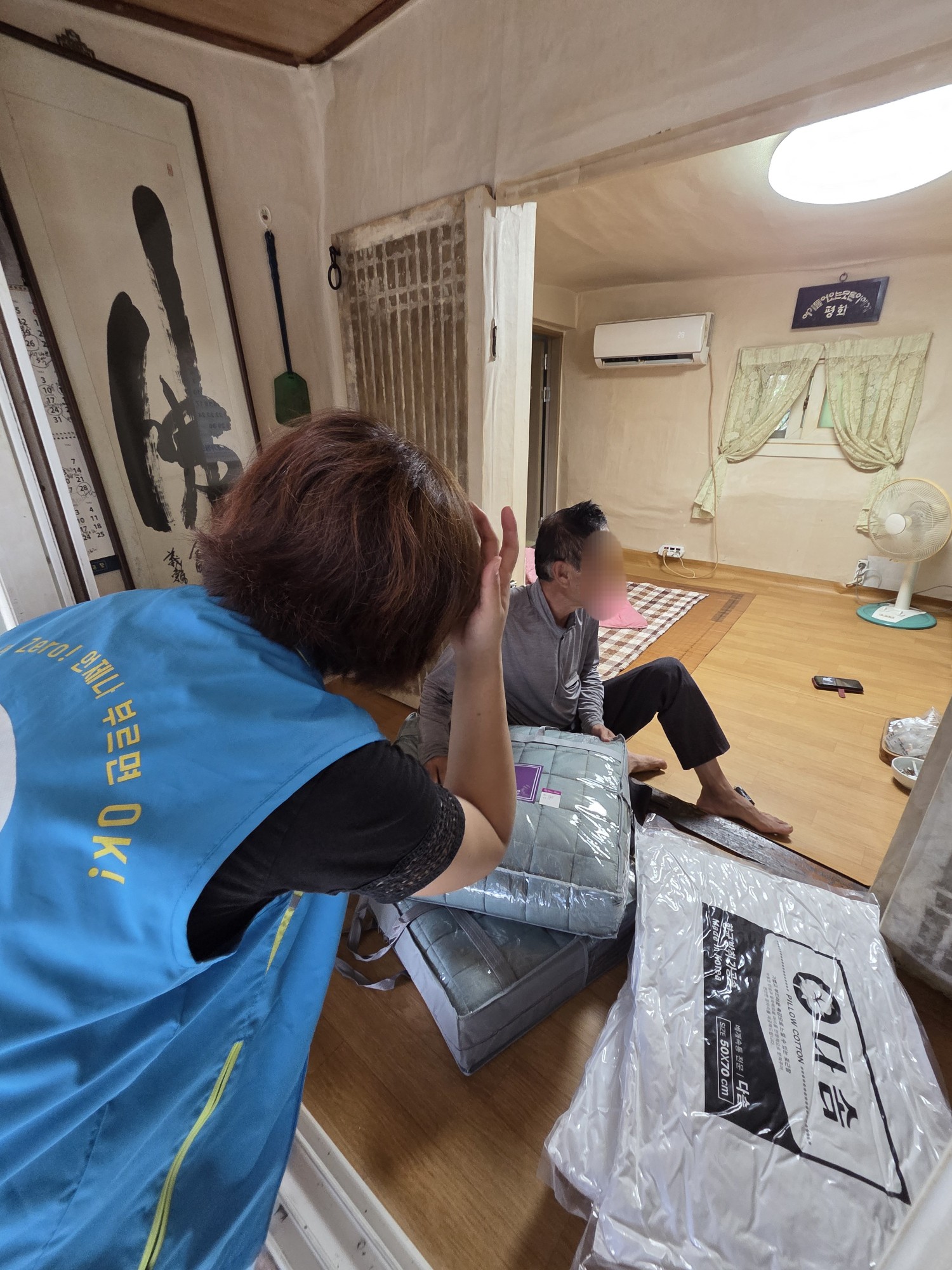 오늘은 기초생활수급자로 군에서 사례관리를 받고 계시는 대상자 정○○ 어르신을 대상으로, 안부를 확인하고 김치, 이불, 각종 식품들을 전달해드리기 위해 통합사례관리사 선생님과 우리동네복지기동대가 함께 출동했습니다!