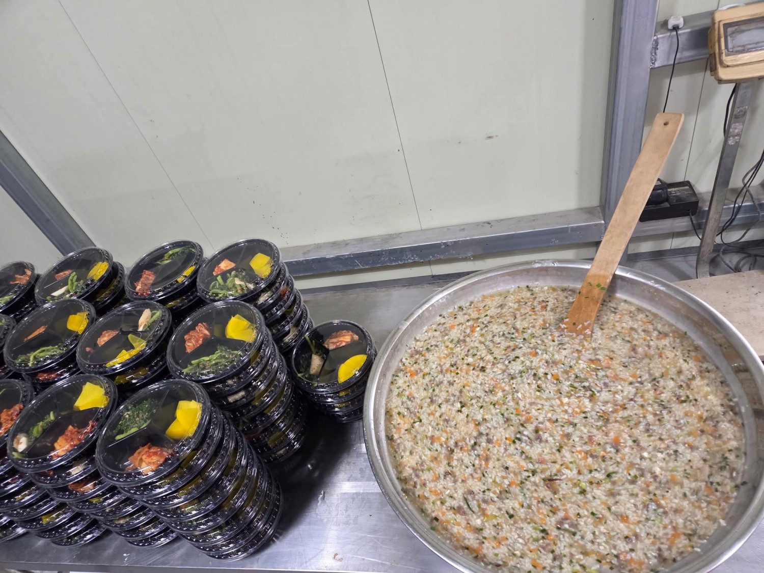 아침 일찍부터 정성스레 준비한 소고기 야채죽과 반찬 100세트를 14개 마을 주민들께 전달하였습니다.