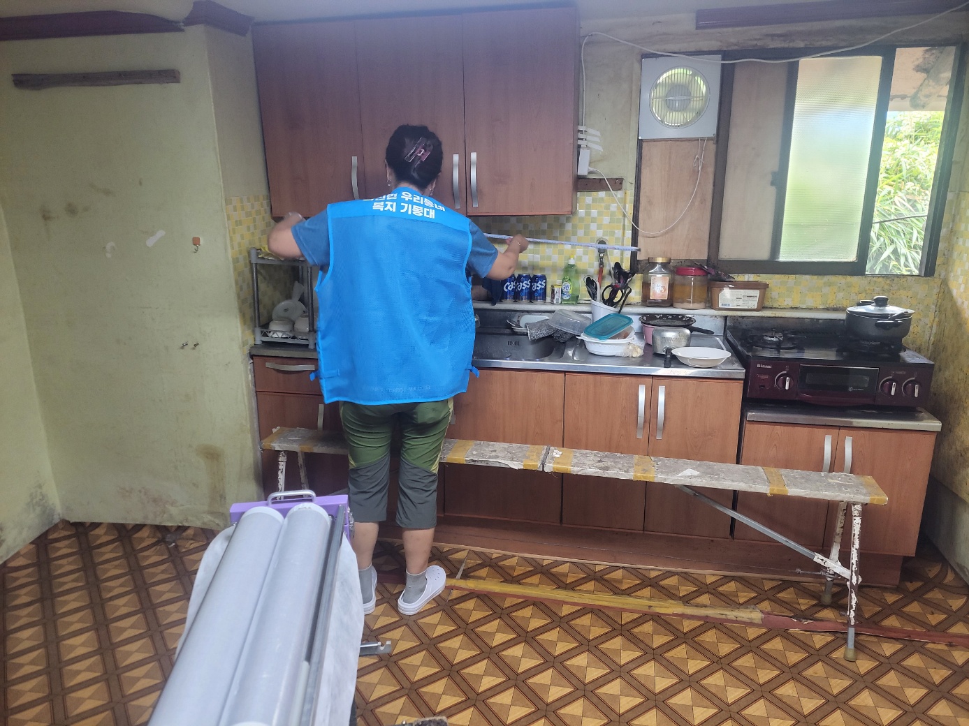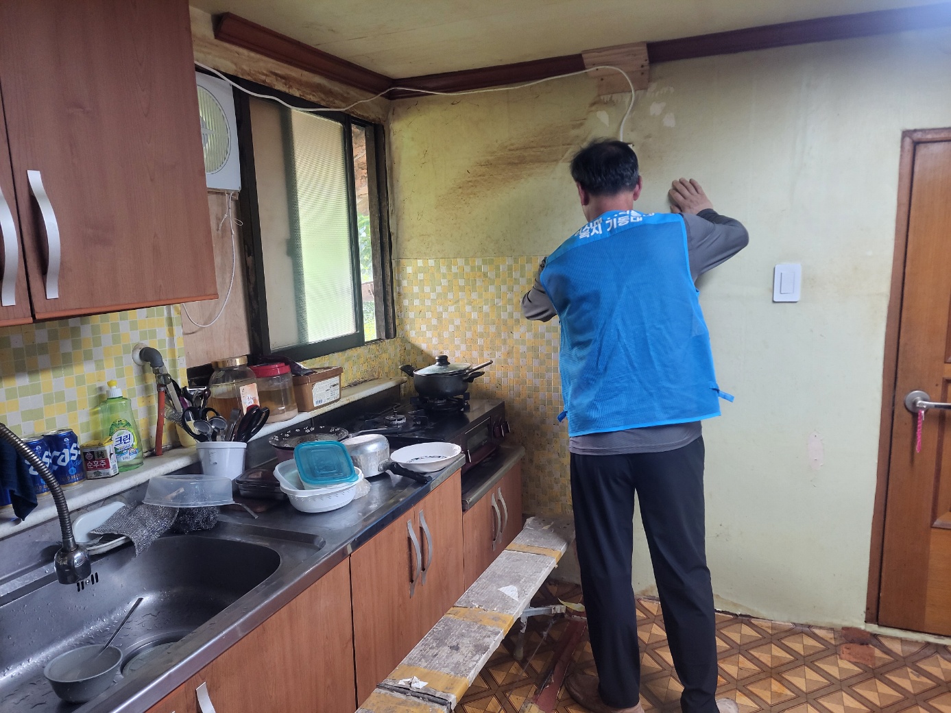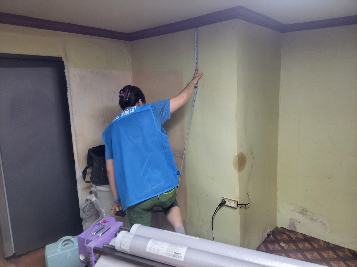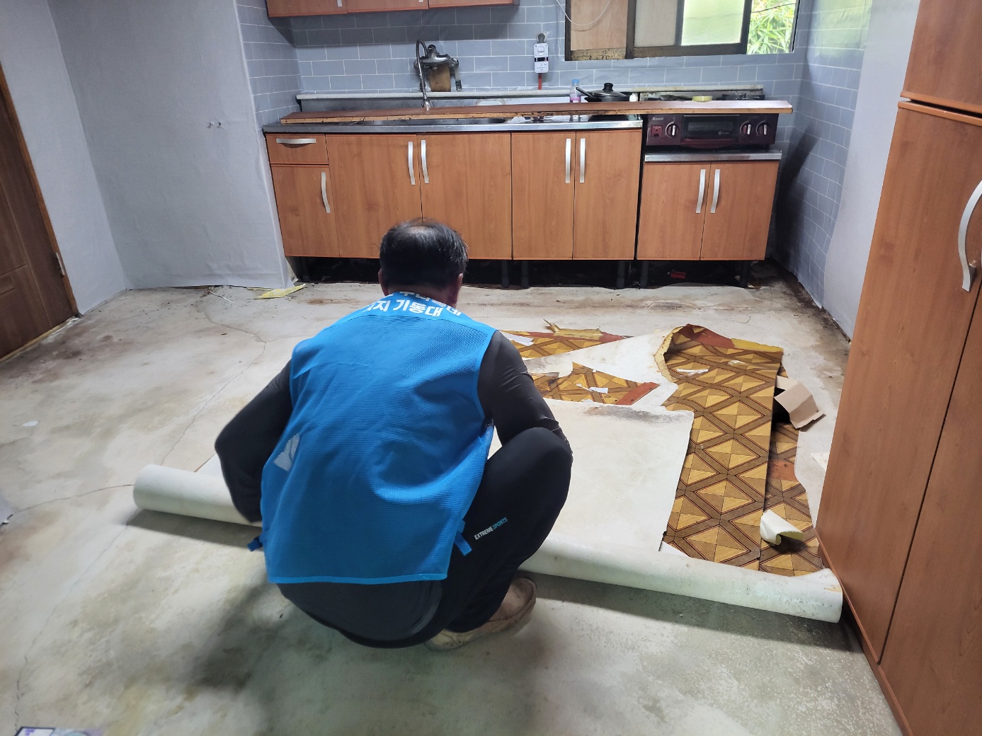 - 지원결과 : 가스타이머콕 설치해드렸으며, 안방과 거실은 도배장판이 깨끗한데 부엌은 한번도 교체한적이 없어 오염되고 곰팡이가 피어있어 쾌적한 환경을 위해 부엌 도배장판까지 교체해드림.