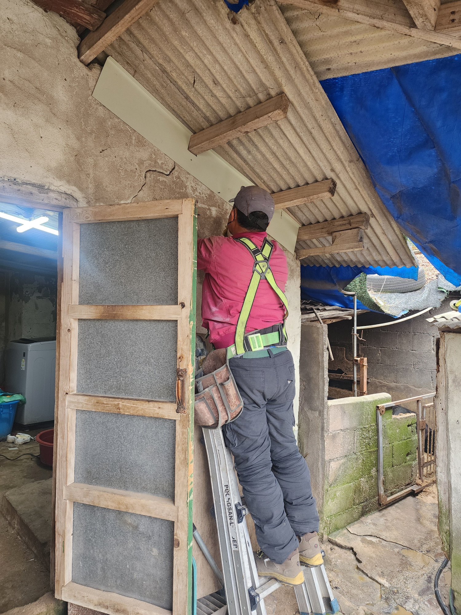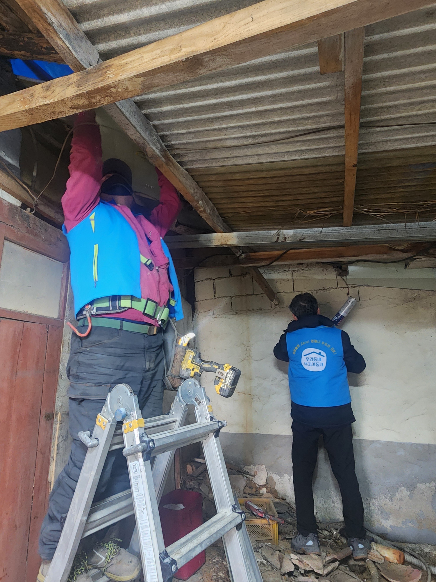 이 가구는, 심한 장애가 있는 대상자와 허리가 불편한 배우자가 세면대가 없어 쭈구려 앉아 세면을 하고, 샤워시설이 없어 대야에 물을 받아 씻는 어려운 상황이었습니다. 또한 천장에 구멍이 있어 외풍을 막을 수 없어 한파에 취약했고, 양변기 역시 금이 가 있어, 안전상 위험한 상황이었습니다.